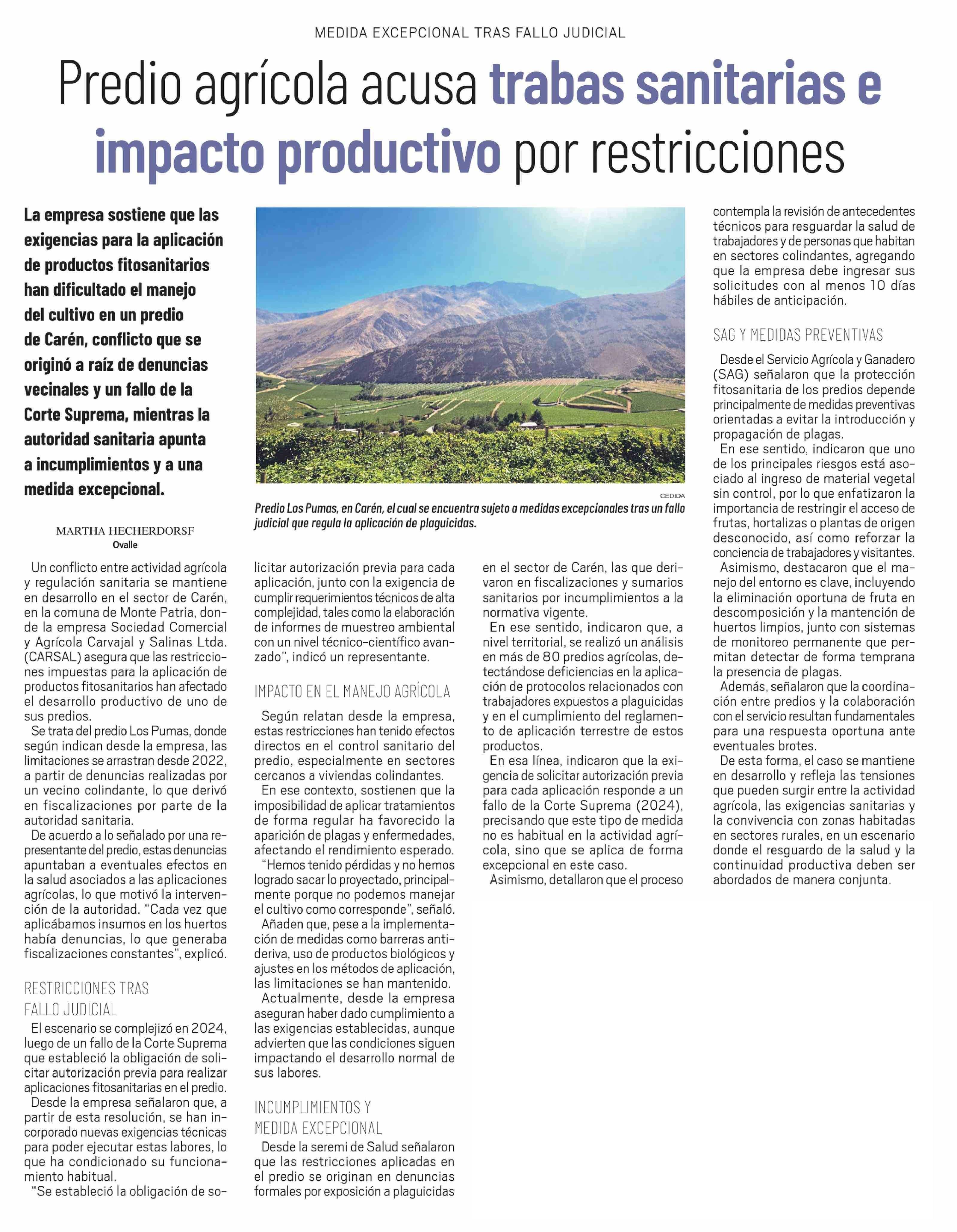 Predio agrícola acusa trabas sanitarias e impacto productivo por restricciones