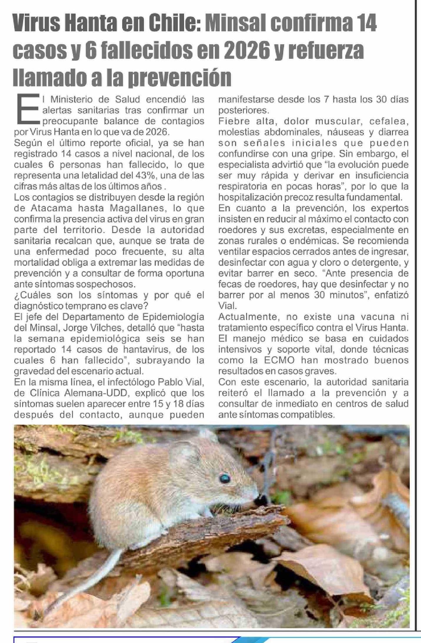Virus Hanta en Chile: Minsal confirma 14 casos y 6 fallecidos en 2026 y refuerza llamado a la prevención
