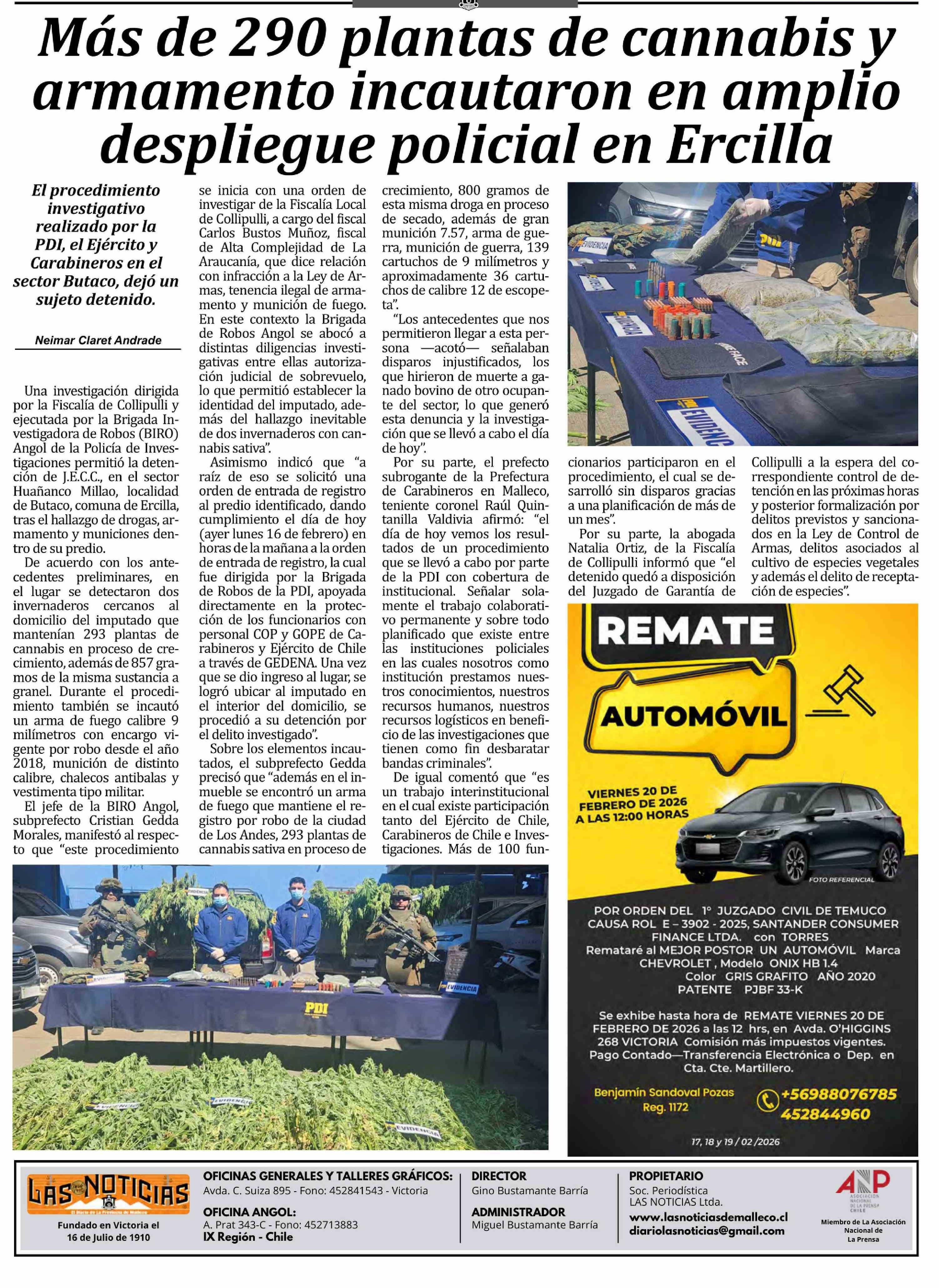 Más de 290 plantas de cannabis y armamento incautaron en amplio despliegue policial en Ercilla