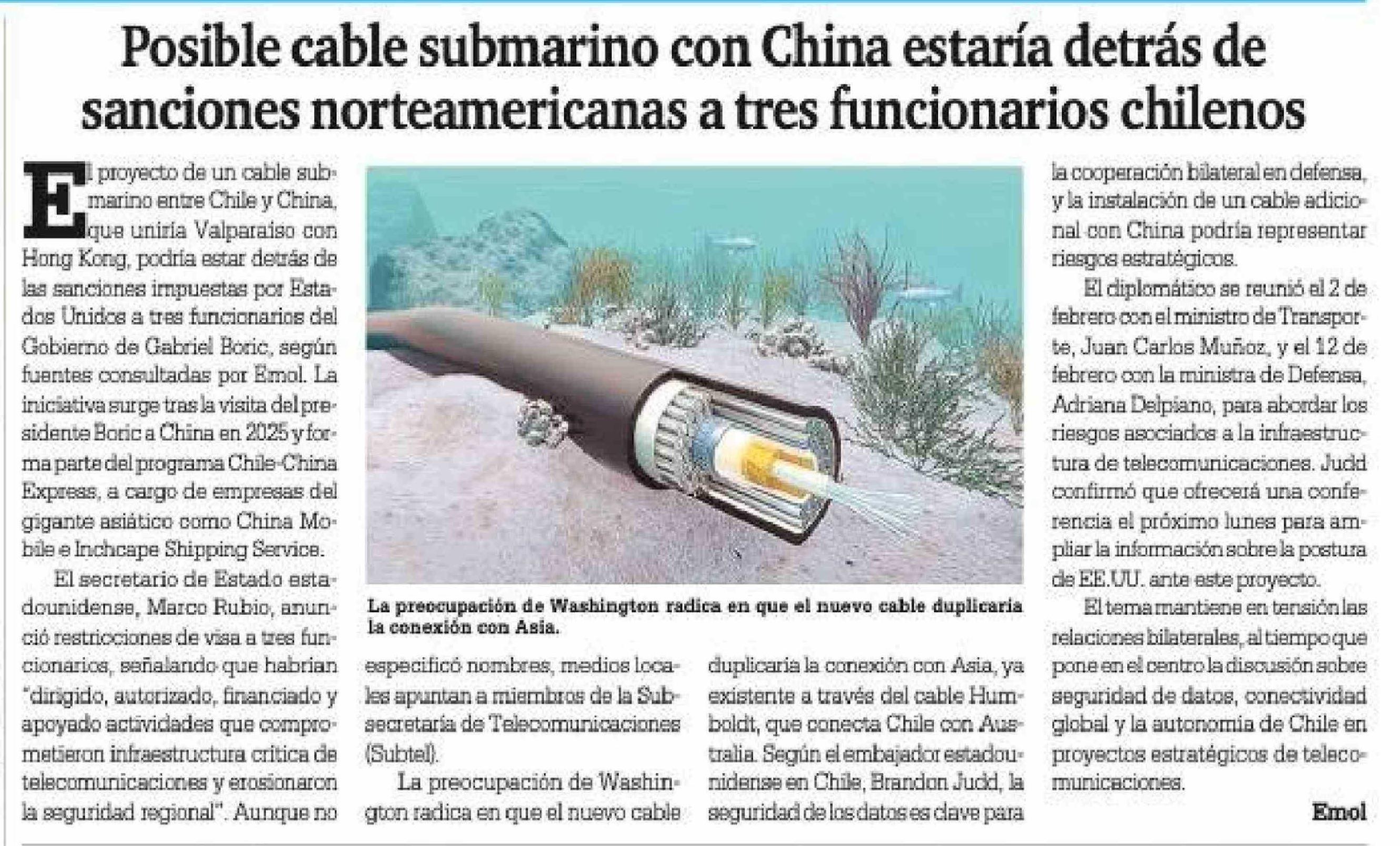 Posible cable submarino con China estaría detrás de sanciones norteamericanas a tres funcionarios chilenos