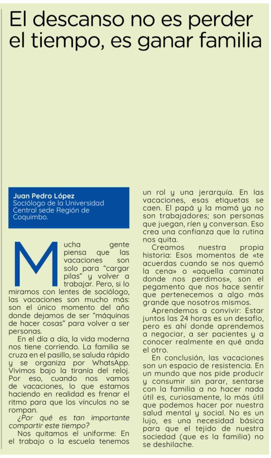 Columnas de Opinión: El descanso no es perder el tiempo, es ganar familia
