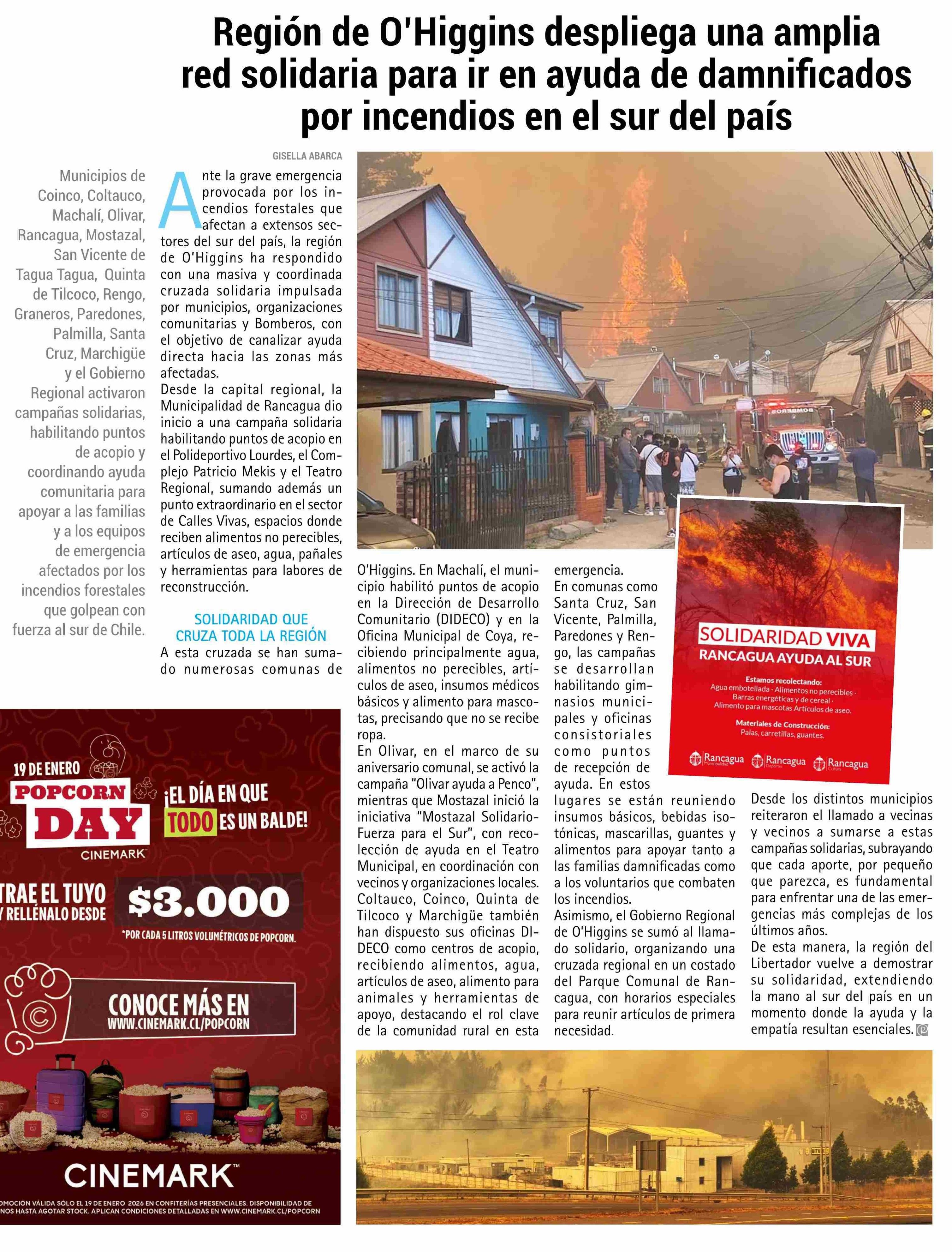 Región de O'Higgins despliega una amplia red solidaria para ir en ayuda de damnificados por incendios en el sur del país