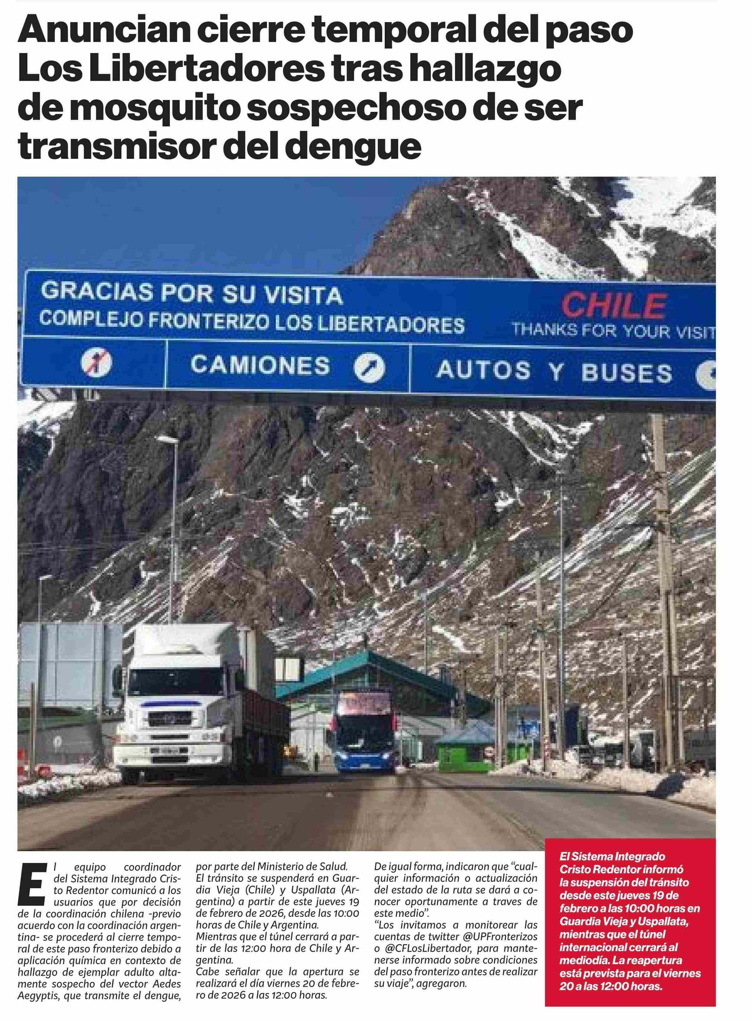 Anuncian cierre temporal del paso Los Libertadores tras hallazgo de mosquito sospechoso de ser transmisor del dengue
