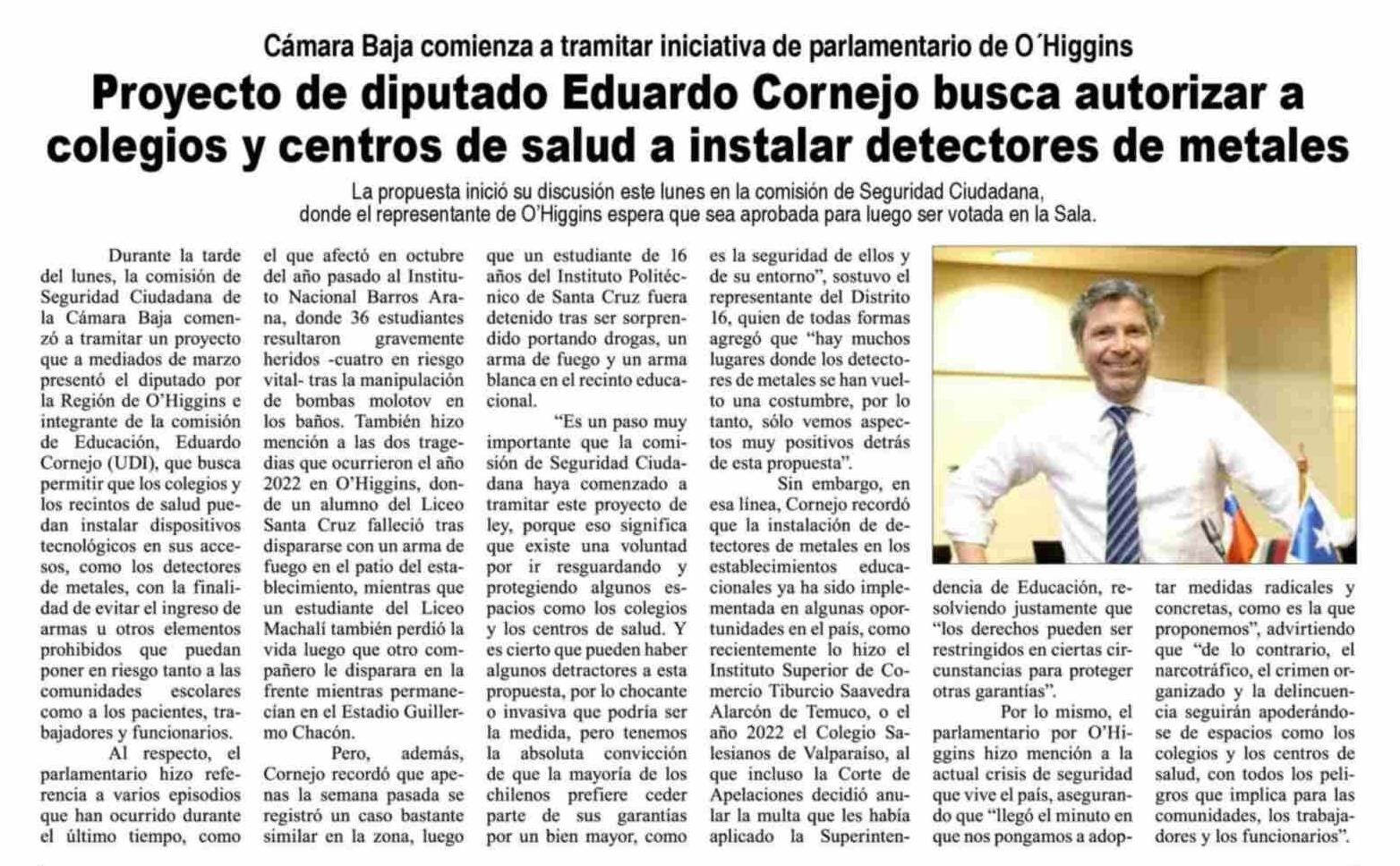 Proyecto de diputado Eduardo Cornejo busca autorizar a colegios y centros de salud a instalar detectores de metales