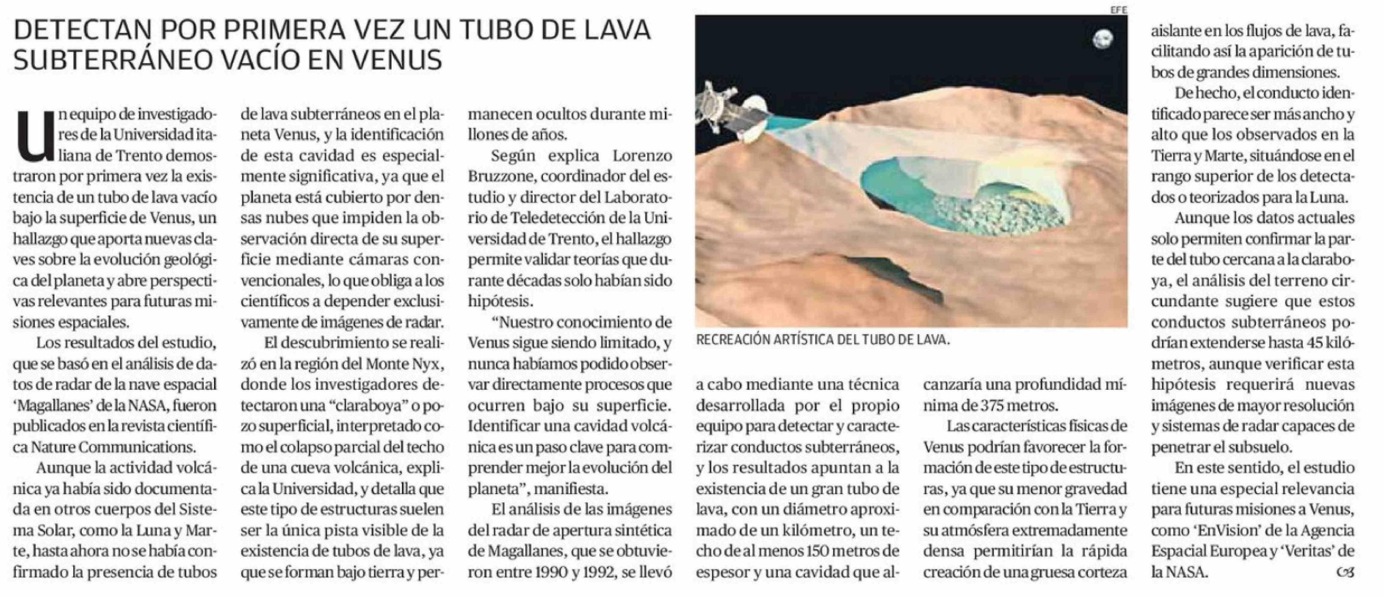 DETECTAN POR PRIMERA VEZ UN TUBO DE LAVA SUBTERRÁNEO VACÍO EN VENUS