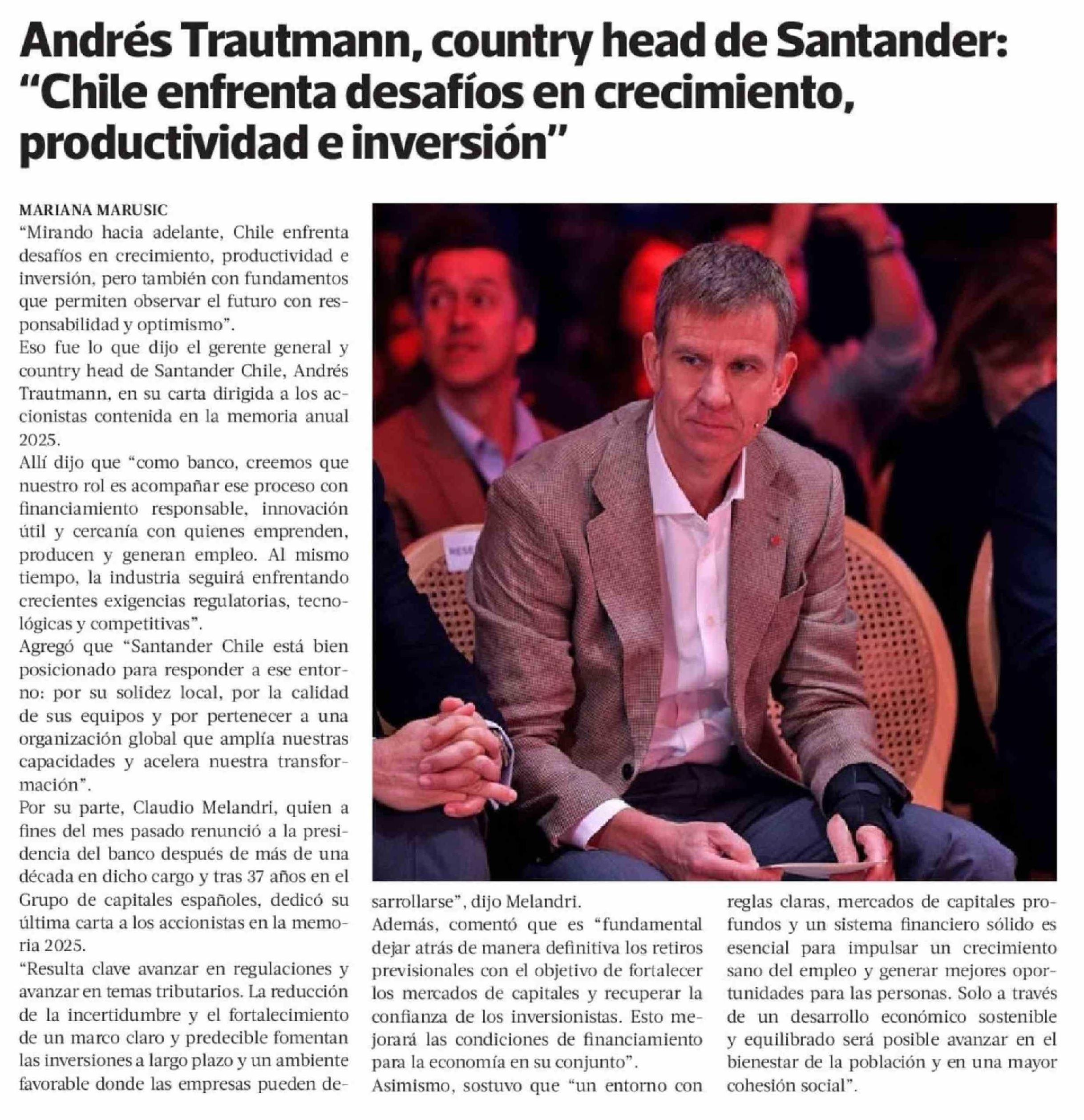 Andrés Trautmann, country head de Santander: "Chile enfrenta desafíos en crecimiento, productividad e inversión"