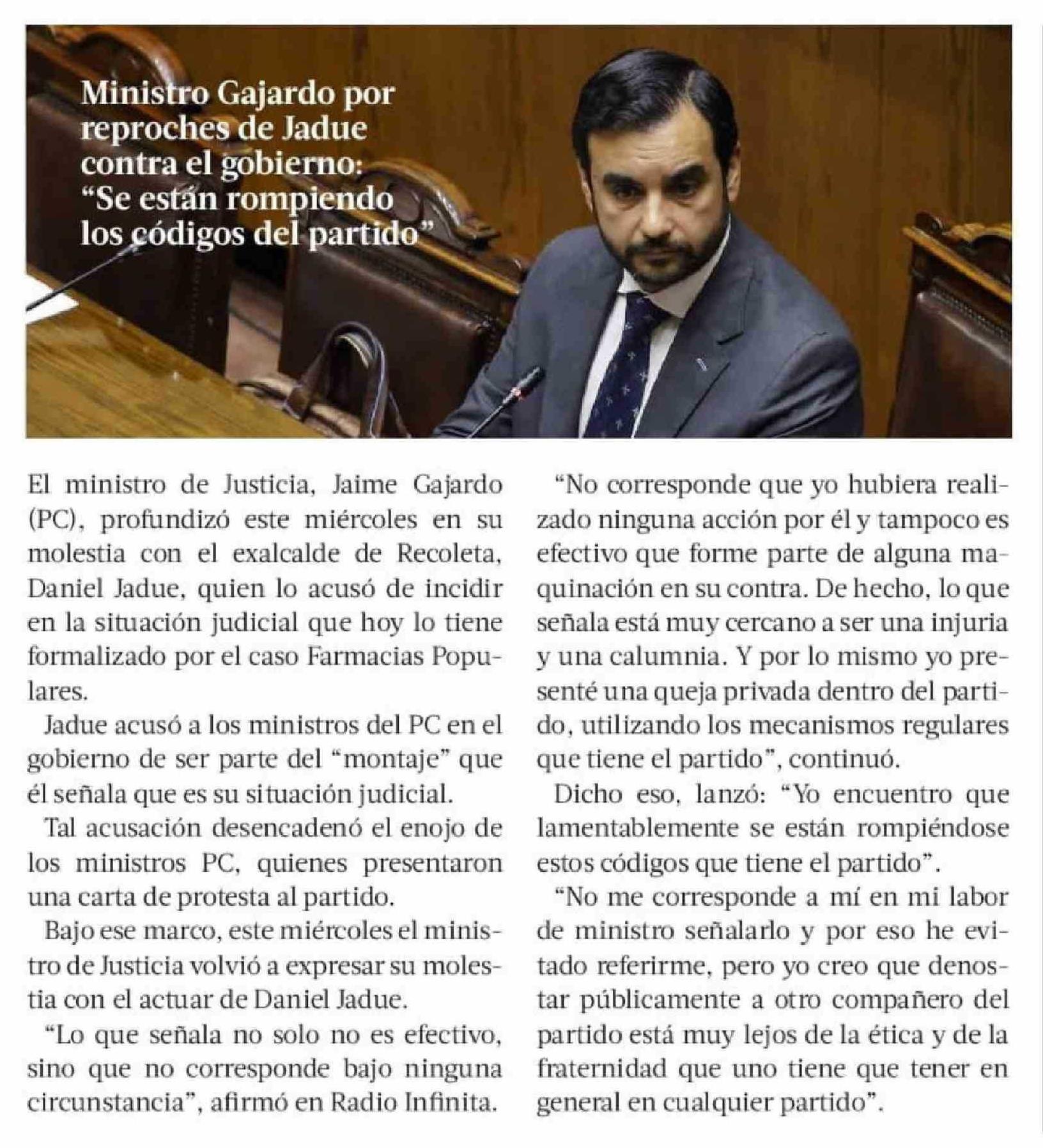 Ministro Gajardo por reproches de Jadue contra el gobierno: "Se están rompiendo los códigos del partido