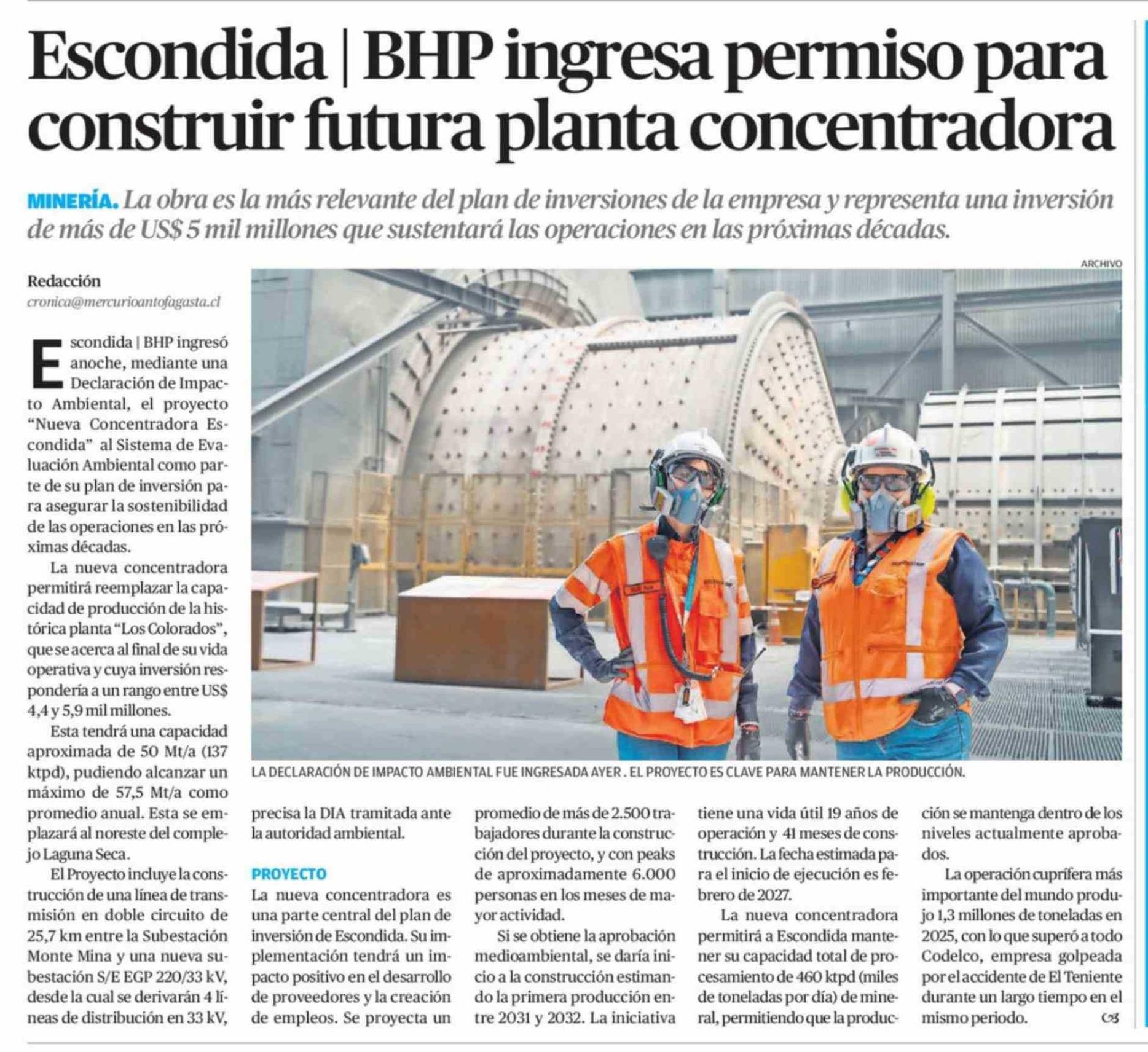 Escondida | BHP ingresa permiso para construir futura planta concentradora