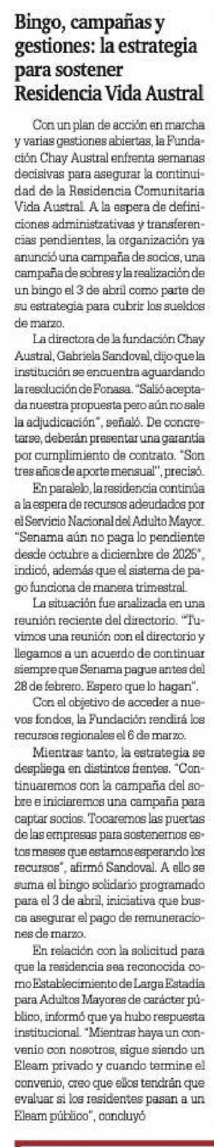 Bingo, campañas y gestiones: la estrategia para sostener Residencia Vida Austral