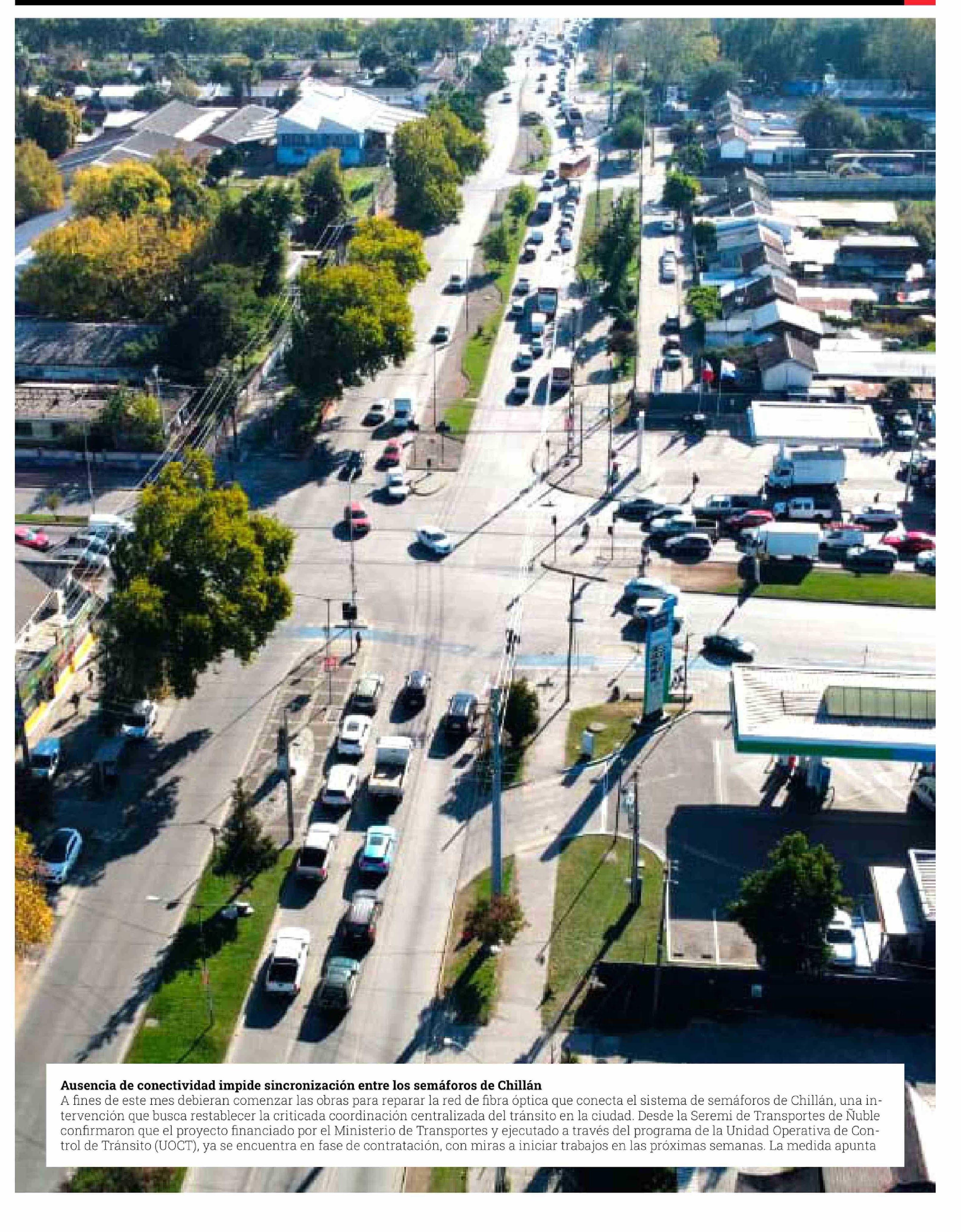 | Título: | Ausencia de conectividad impide sincronización entre los semáforos de Chillán A fines de este mes debieran comenzar las obras para reparar la red de fibra óptica que conecta el sistema de semáforos de Chillán, una intervención que busca restablecer la criticada coordinación centralizada del tránsito |