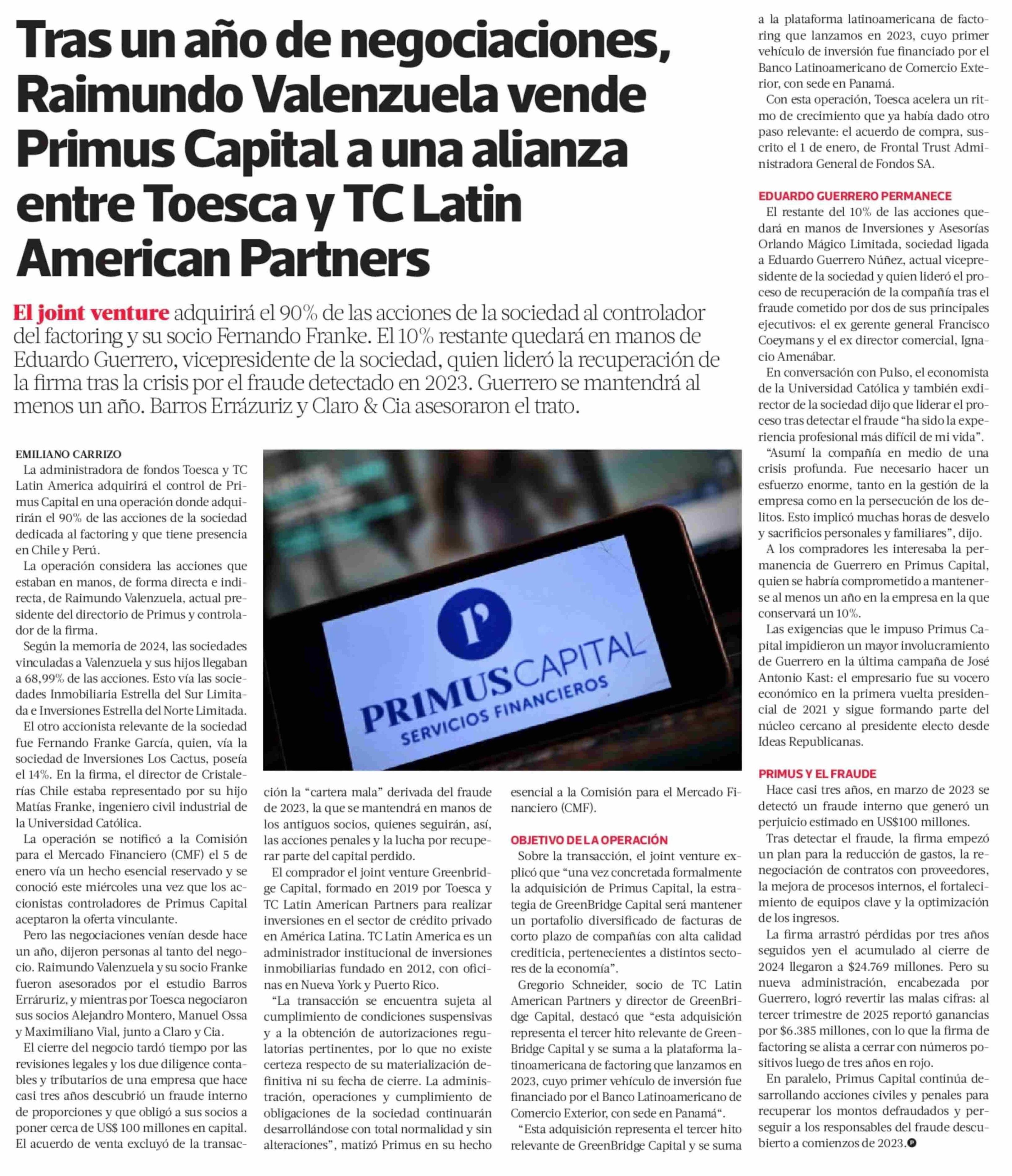 Tras un año de negociaciones, Raimundo Valenzuela vende Primus Capital a una alianza entre Toesca y TC Latin American Partners