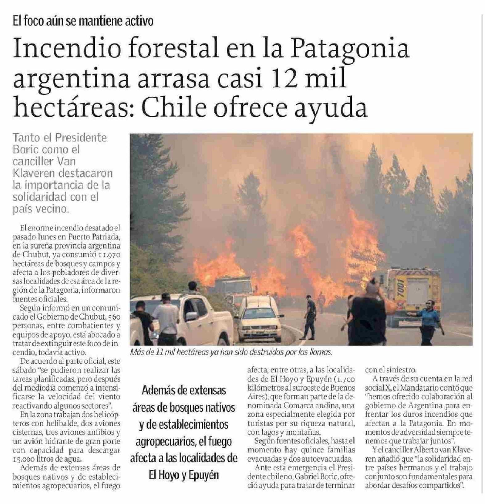 Título: Incendio forestal en la Patagonia argentina arrasa casi 12 mil hectáreas: Chile ofrece ayuda