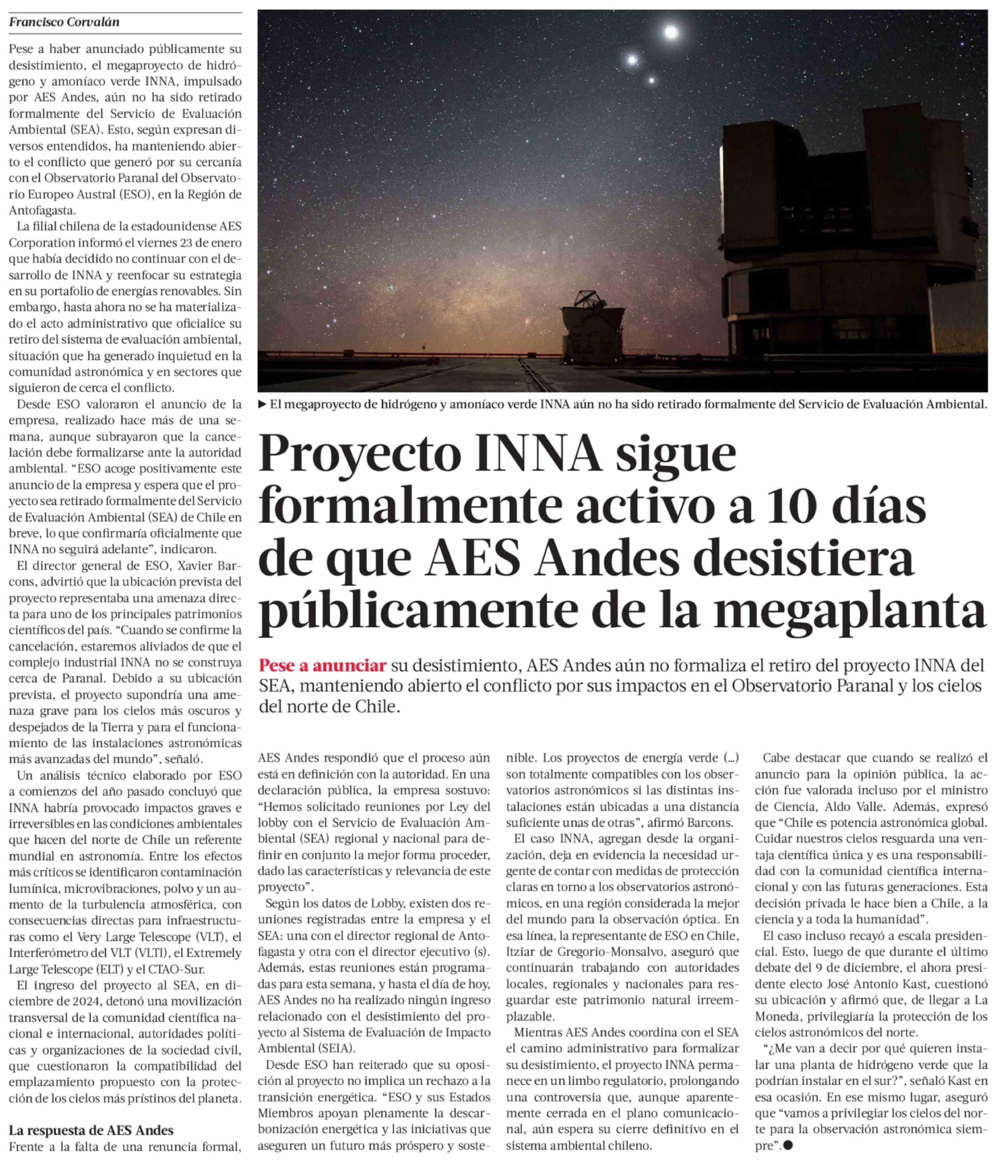 Proyecto INNA sigue formalmente activo a 10 días de que AES Andes desistiera públicamente de la megaplanta