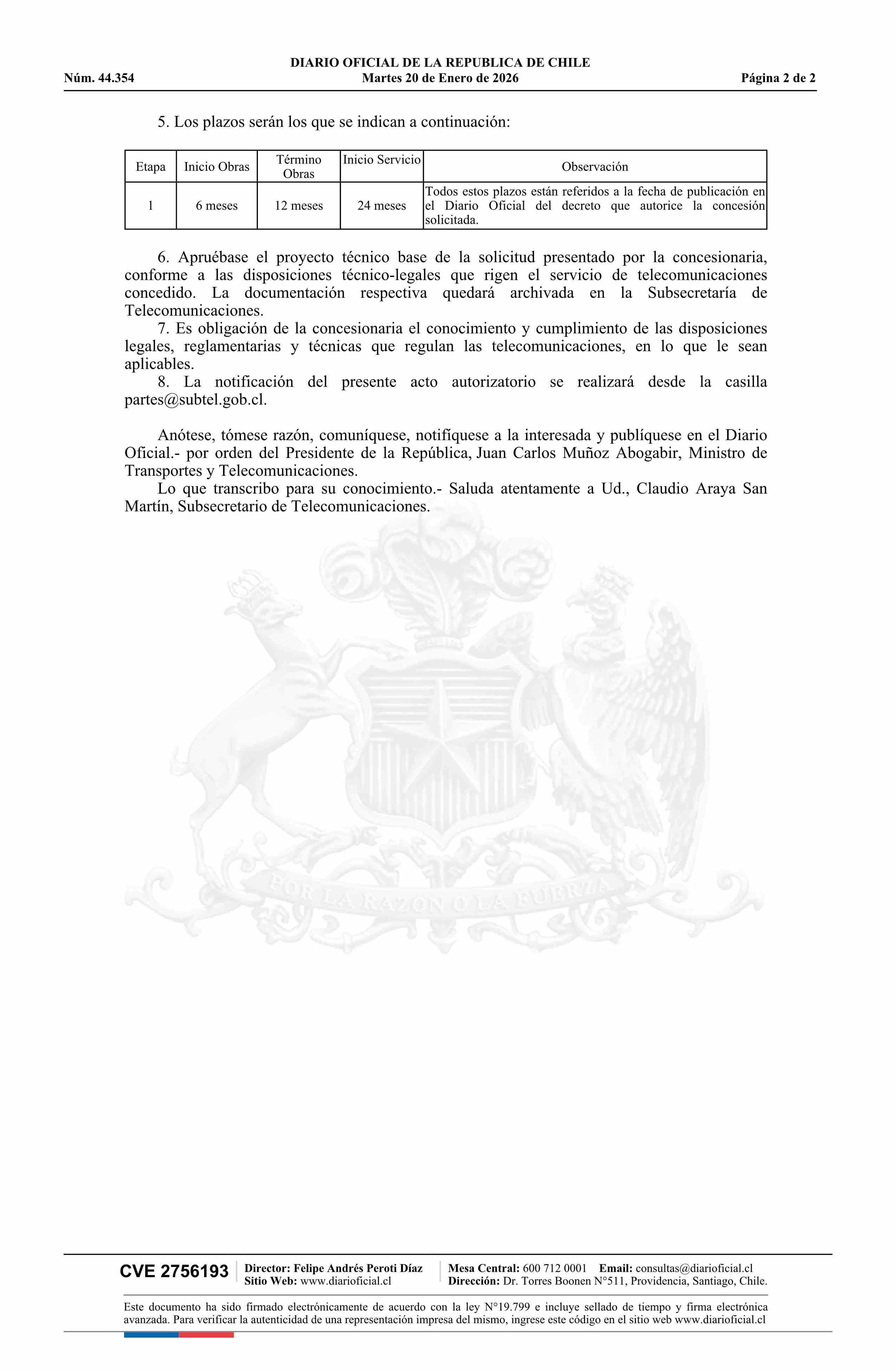 | Título: | Decreto número 142, de 2025.- Otorga concesión de servicio público de telecomunicaciones, a la empresa Armada Systems Chile SpA |