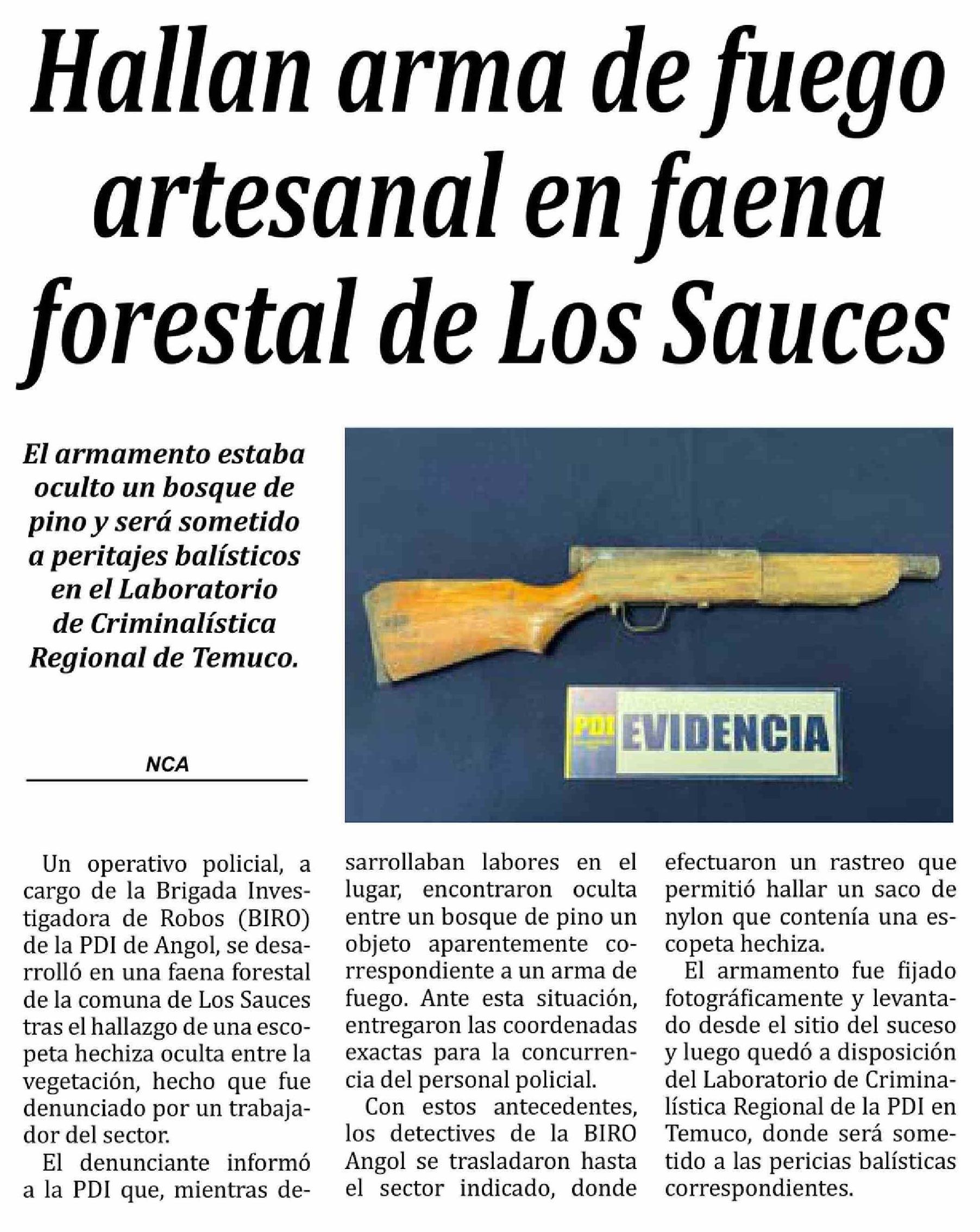 Hallan arma de fuego artesanal en faena forestal de Los Sauces