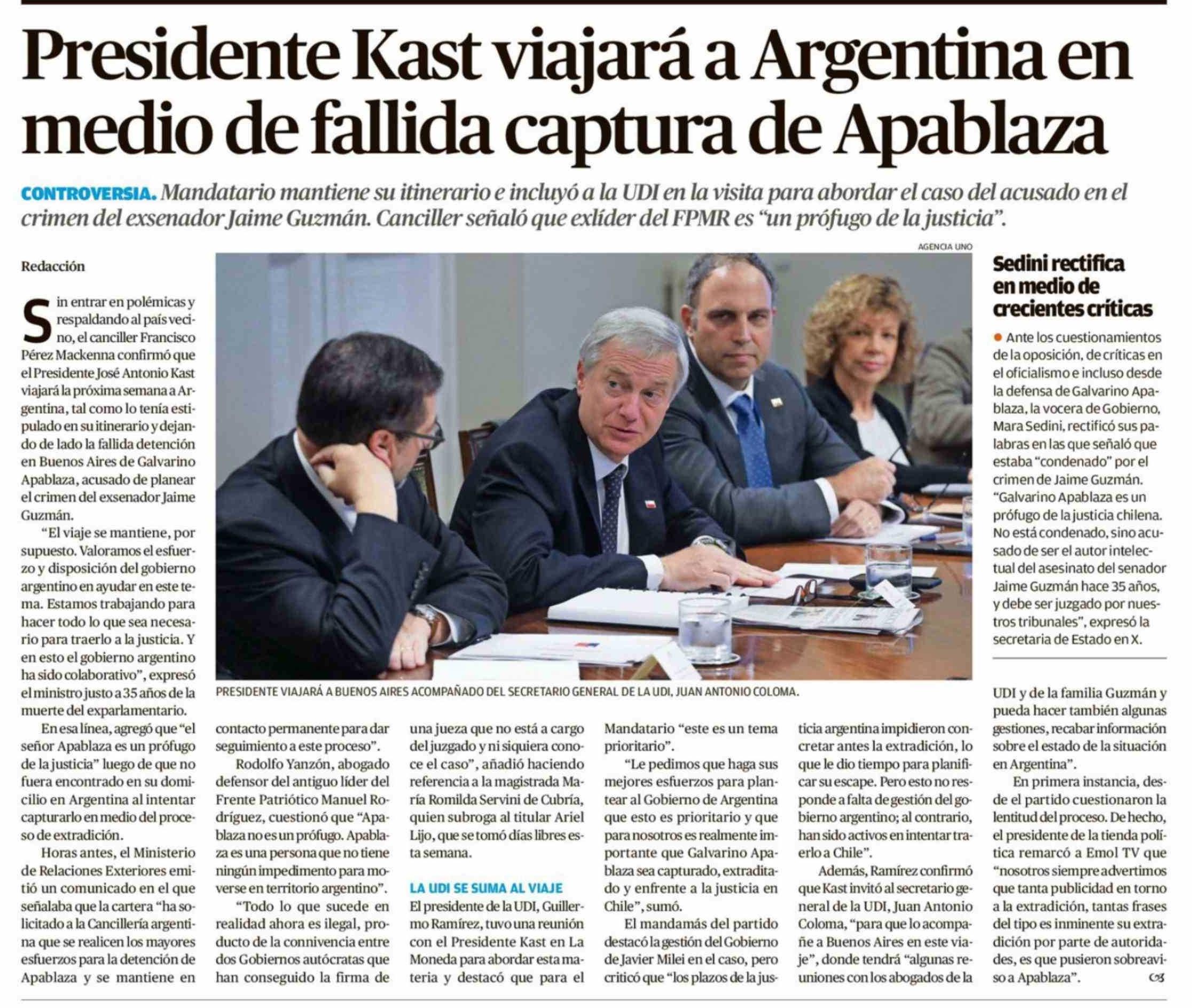 Presidente Kast viajará a Argentina en medio de fallida captura de Apablaza