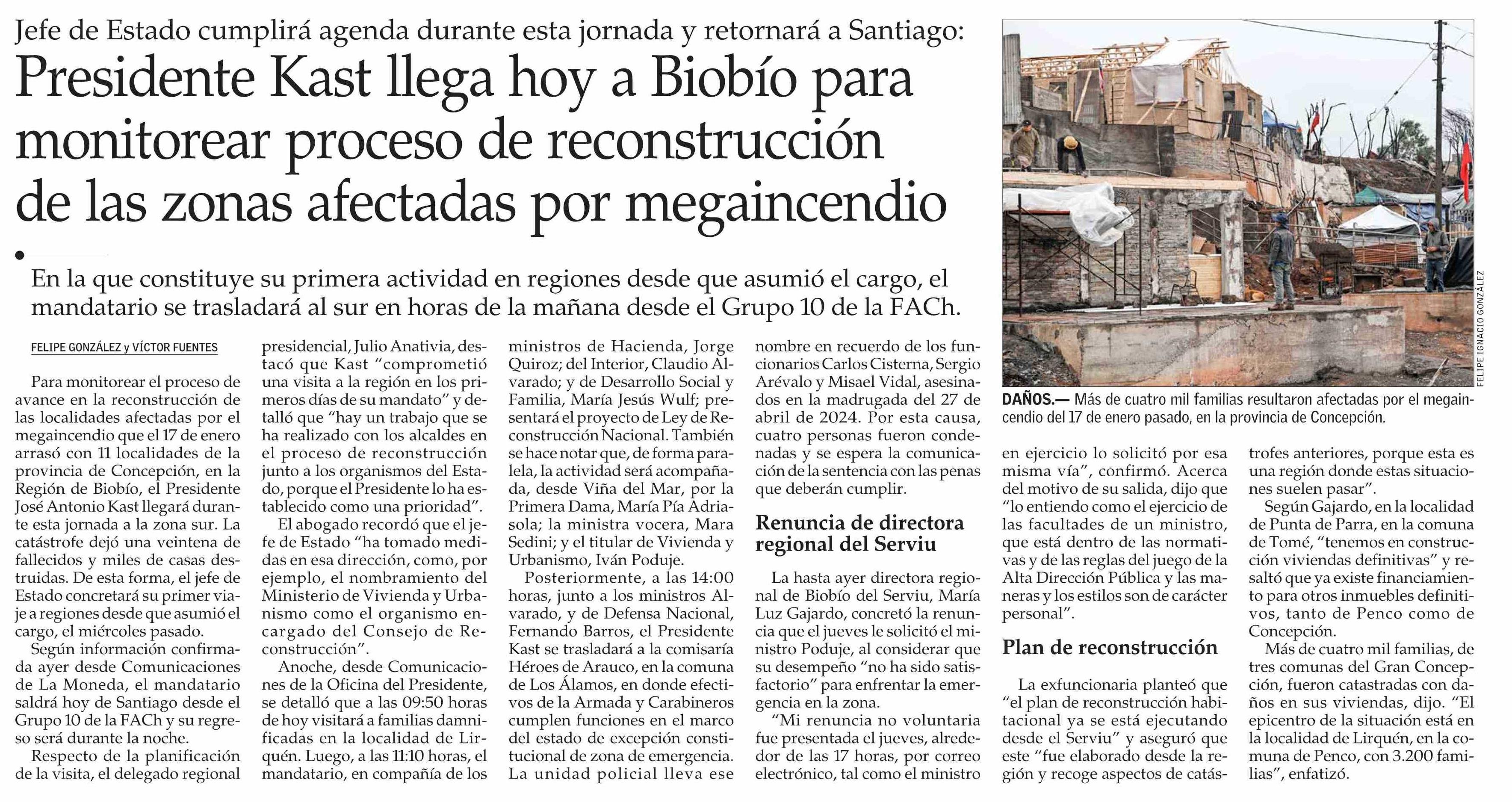 Presidente Kast llega hoy a Biobío para monitorear proceso de reconstrucción de las zonas afectadas por megaincendio