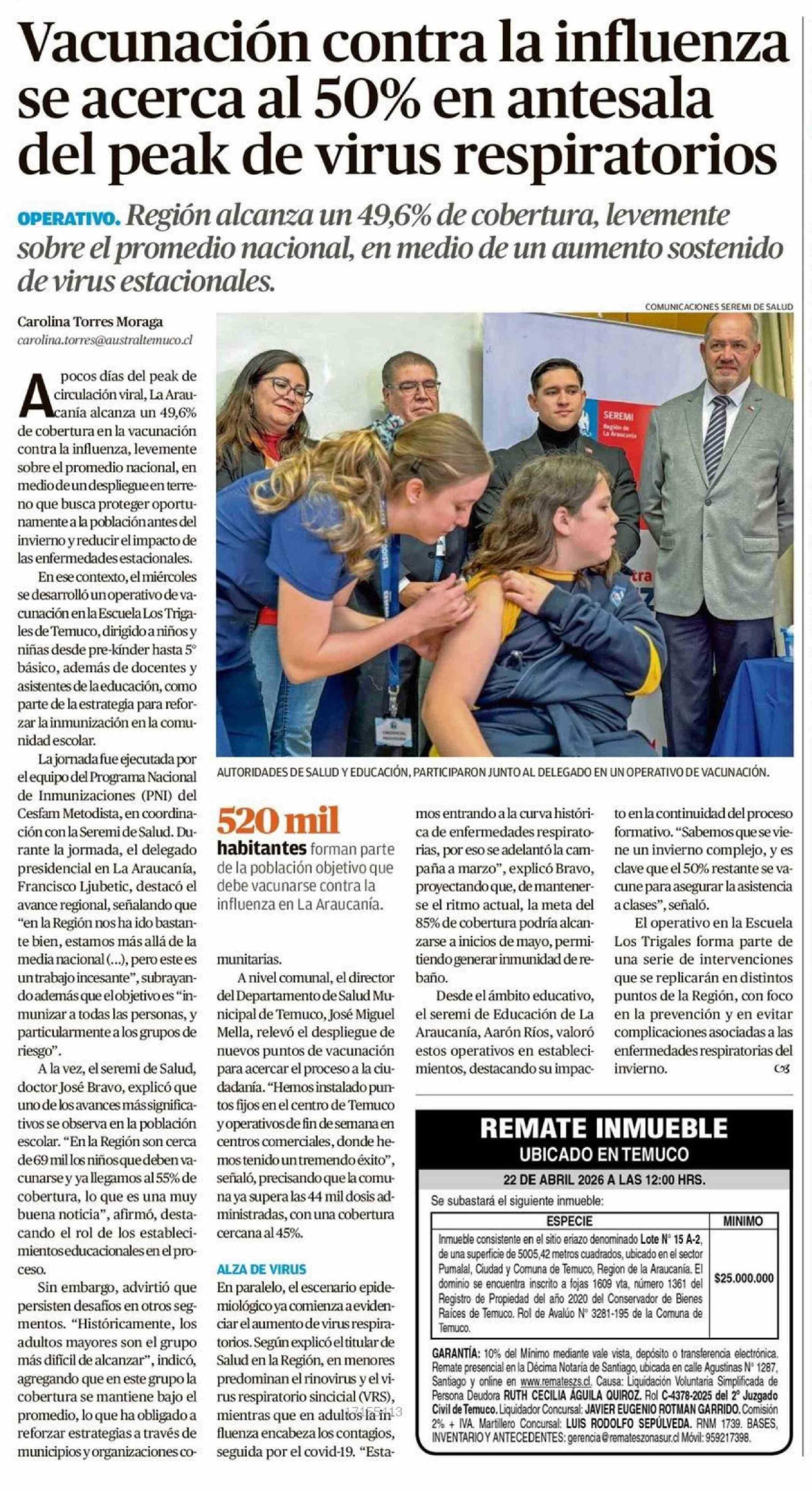 Vacunación contra la influenza se acerca al 50% en antesala del peak de virus respiratorios
