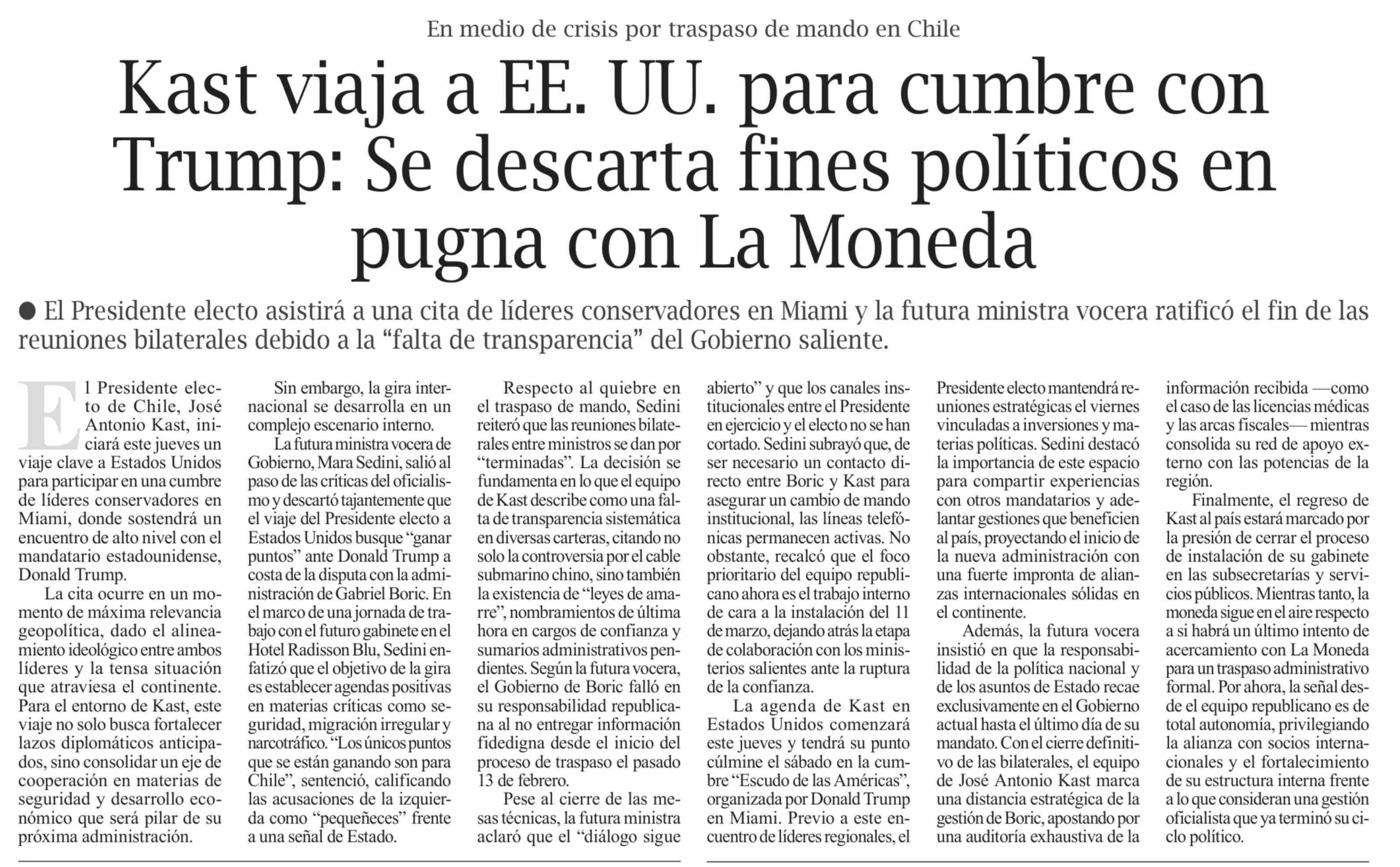 Kast viaja a EE. UU. para cumbre con Trump: Se descarta fines políticos en pugna con La Moneda