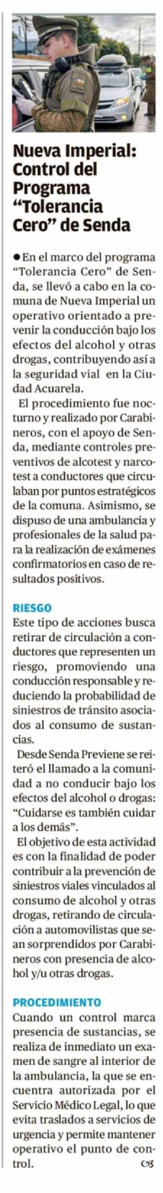 Nueva Imperial: Control del Programa "Tolerancia Cero" de Senda