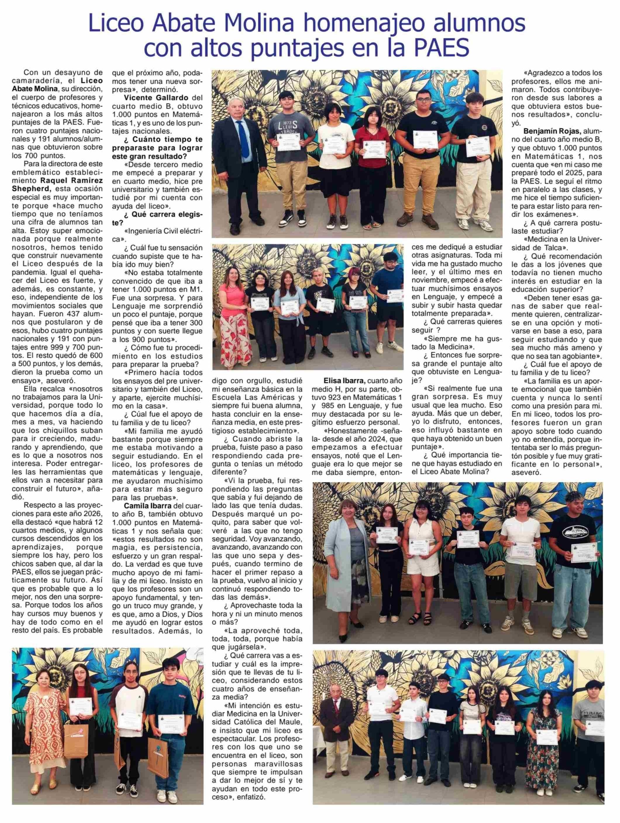 Liceo Abate Molina homenajeo alumnos con altos puntajes en la PAES