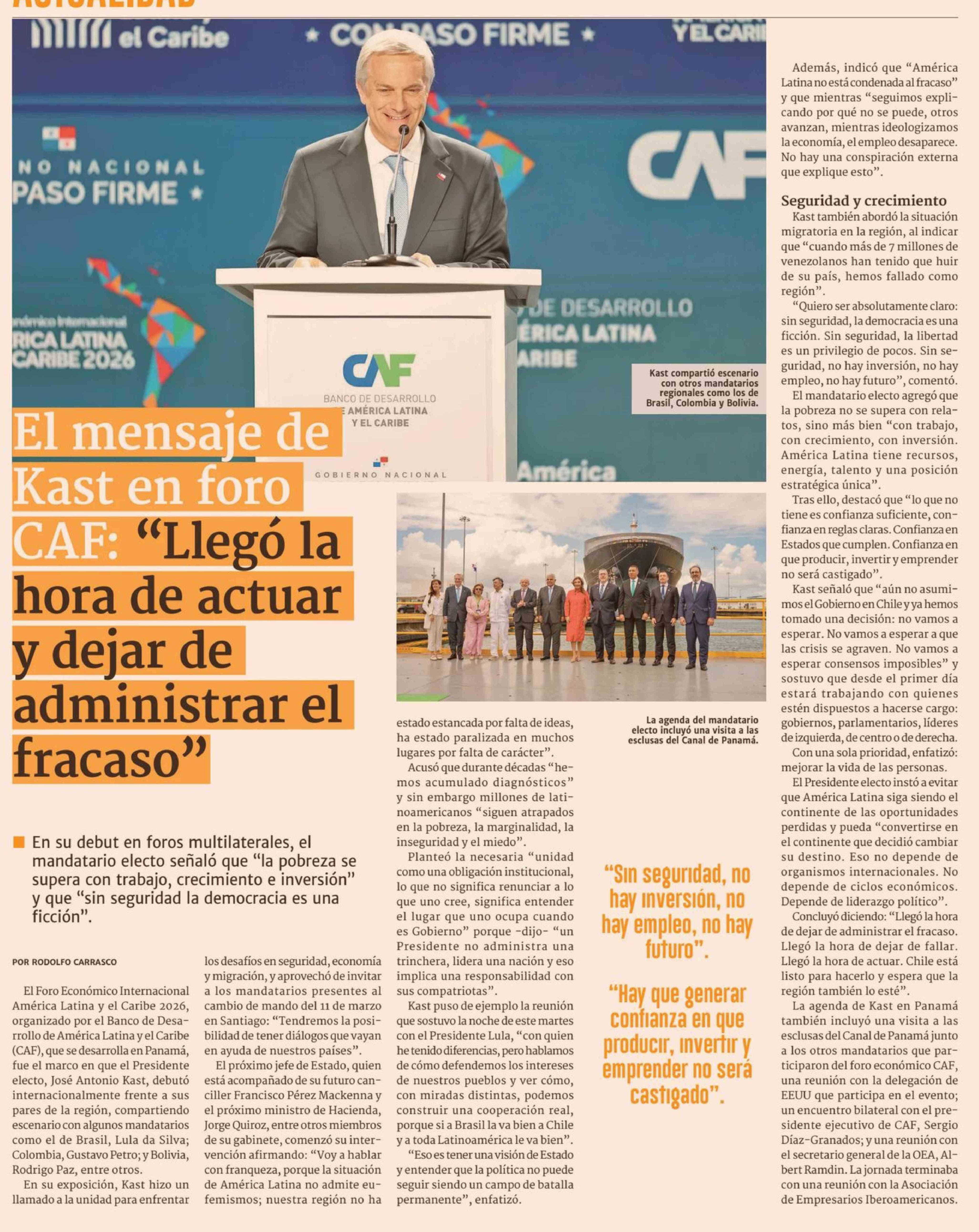 El mensaje de Kast en foro CAF: "Llegó la hora de actuar y dejar de administrar el fracaso"