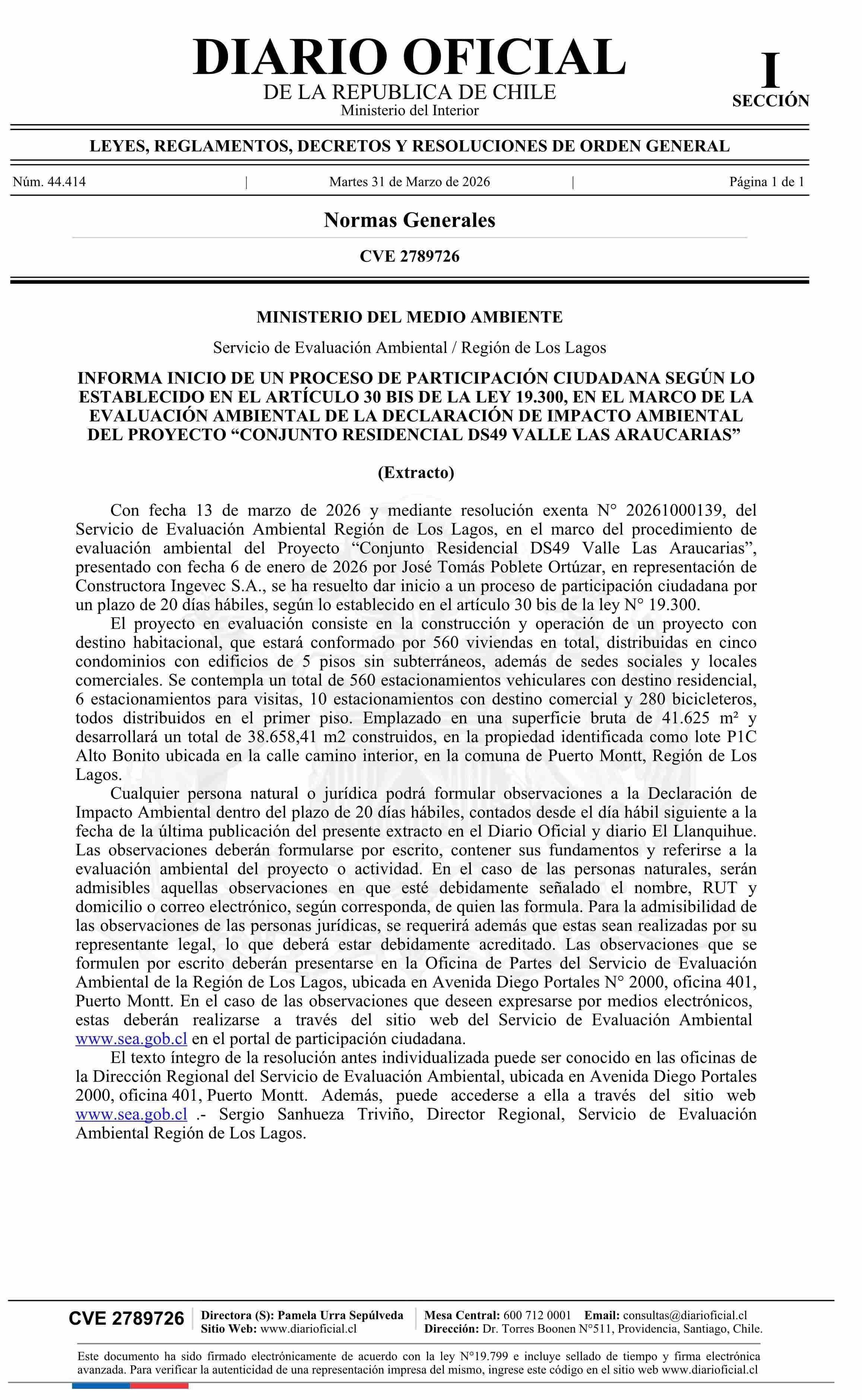 | Título: | MINISTERIO DEL MEDIO AMBIENTE Servicio de Evaluación Ambiental / Región de Los Lagos INFORMA INICIO DE UN PROCESO DE PARTICIPACIÓN CIUDADANA SEGÚN LO ESTABLECIDO EN EL ART ÍCULO 30 BIS DE LA LEY 19.300, EN EL MARCO DE LA EVALUACIÓN AMBIENTAL DE LA DECLARACIÓN DE IMPACTO AMBIENTAL DEL PROYECTO “CONJU |