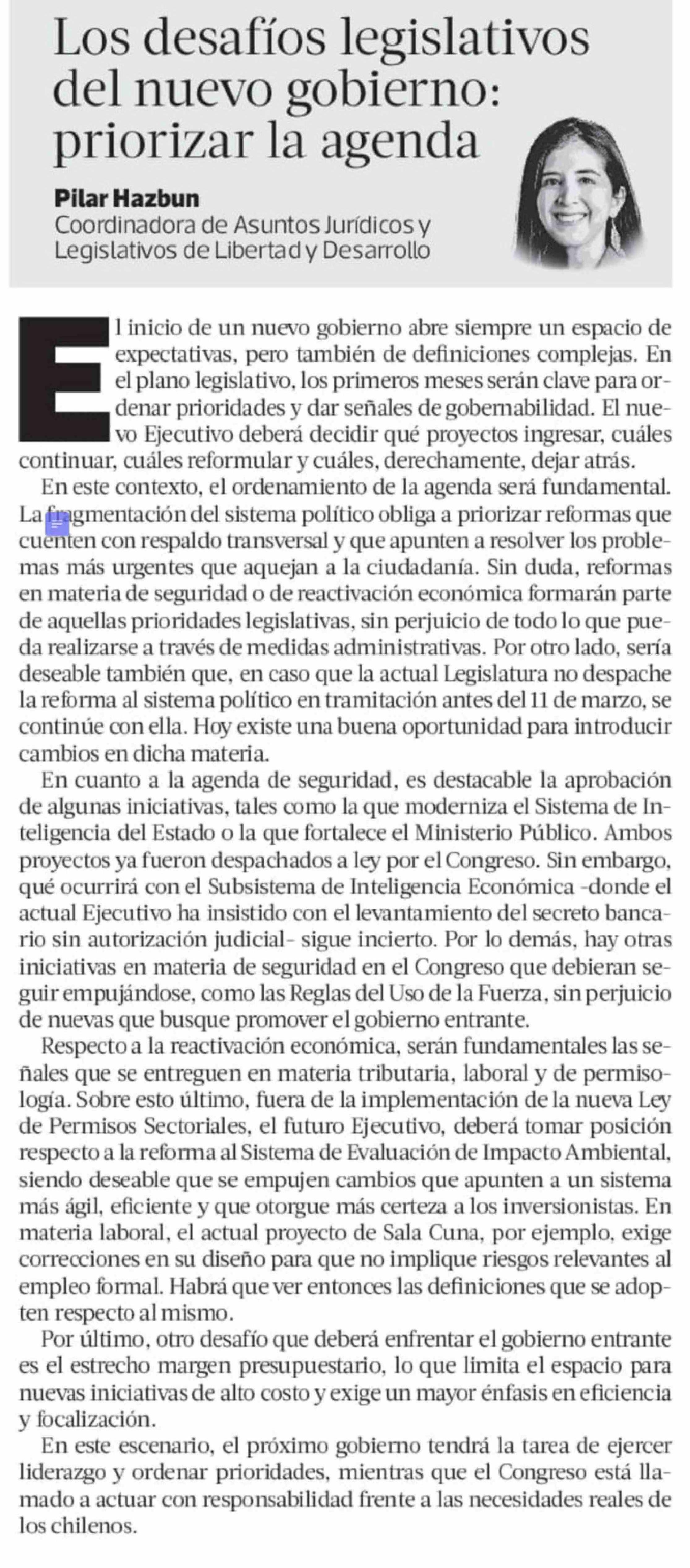 Columnas de Opinión: Los desafíos legislativos del nuevo gobierno: priorizar la agenda