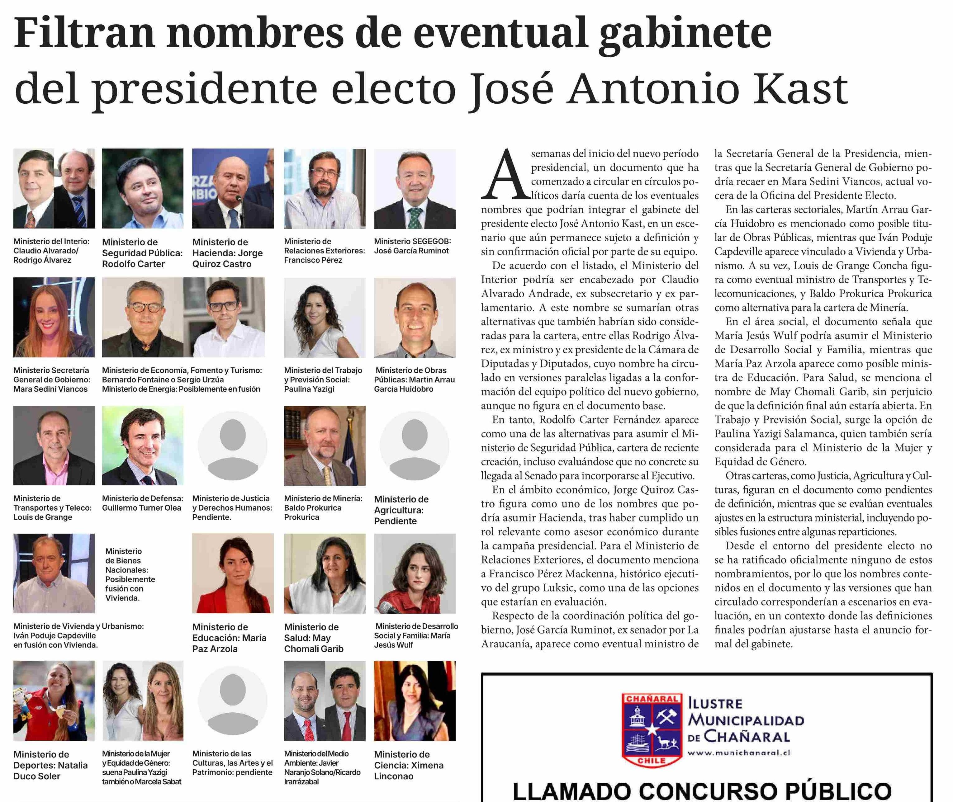 Filtran nombres de eventual gabinete del presidente electo José Antonio Kast