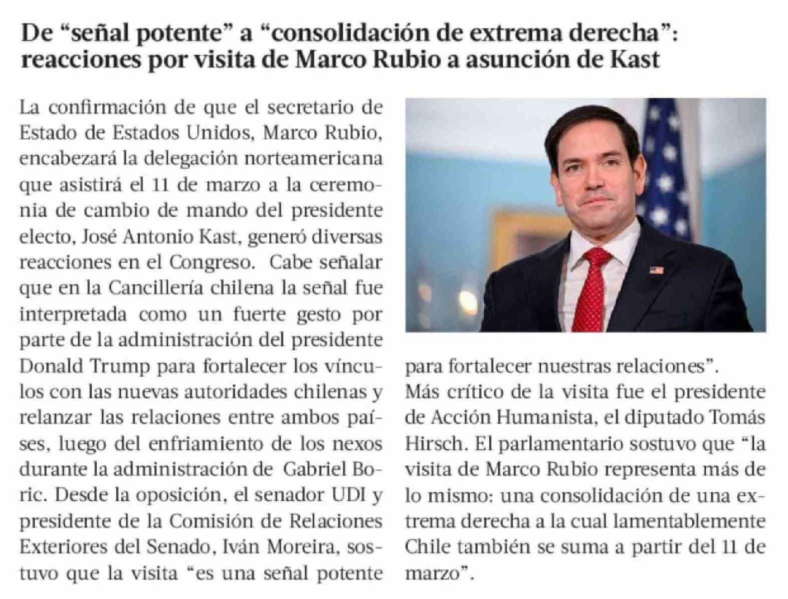 De "señal potente" a "consolidación de extrema derecha": reacciones por visita de Marco Rubio a asunción de Kast