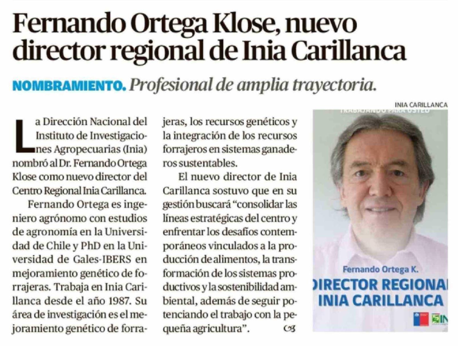 Fernando Ortega Klose, nuevo director regional de Inia Carillanca