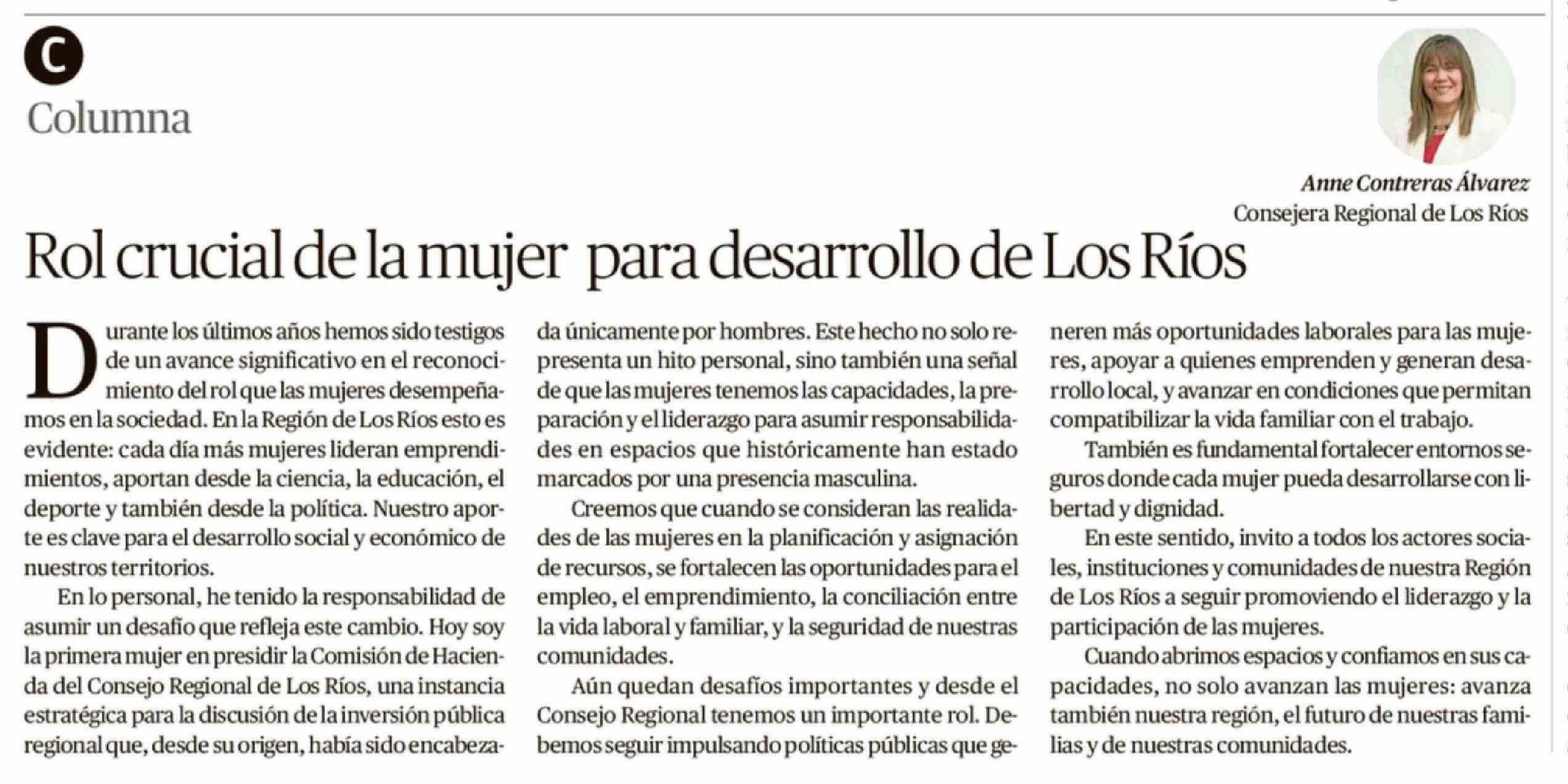 Columnas de Opinión: Rol crucial de la mujer para desarrollo de Los Ríos