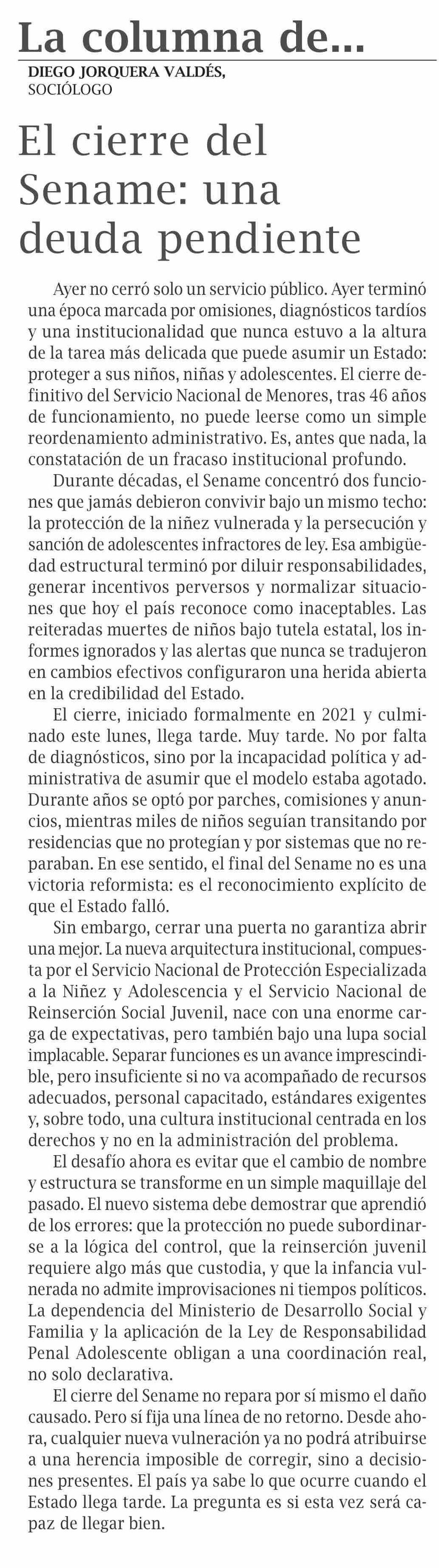Columnas de Opinión: El cierre del Sename: una deuda pendiente
