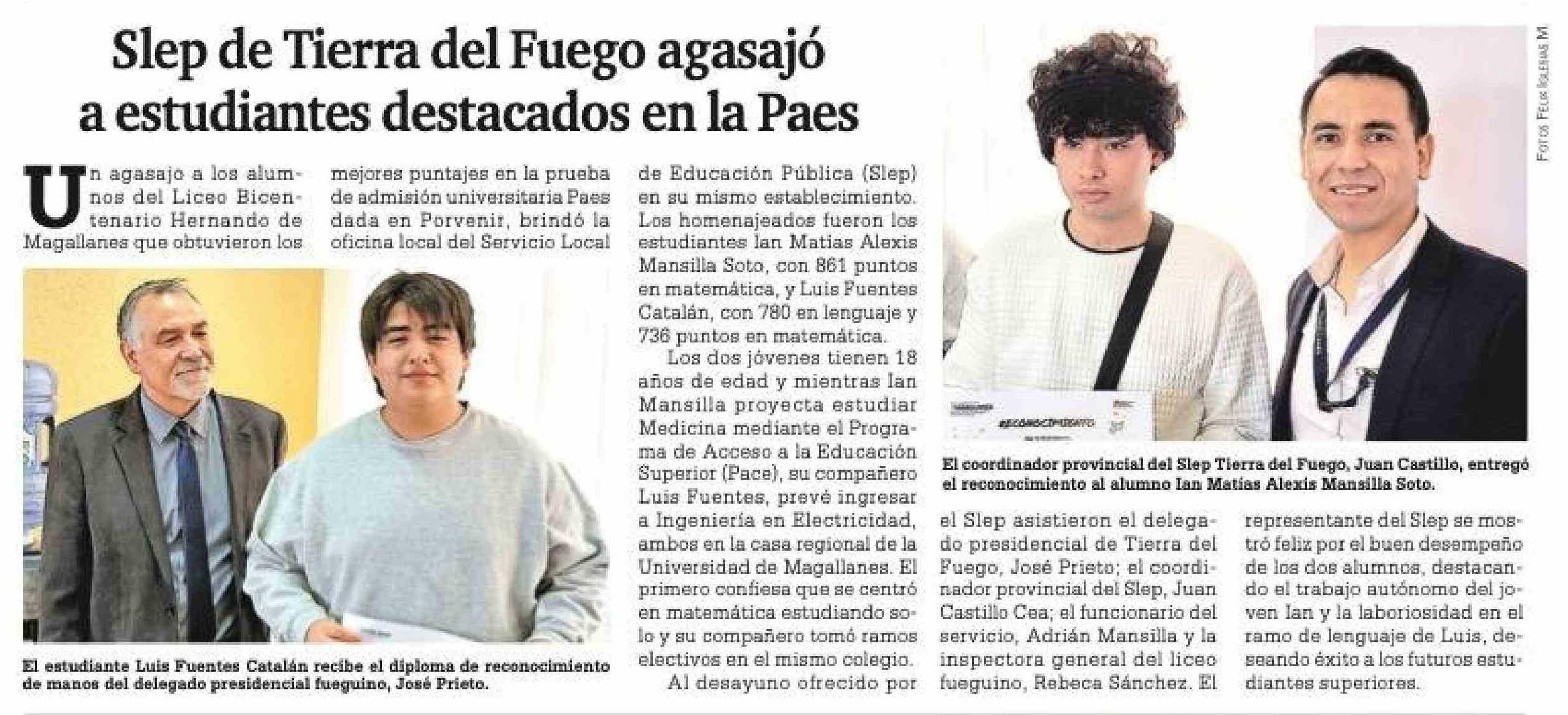Slep de Tierra del Fuego agasajó a estudiantes destacados en la Paes