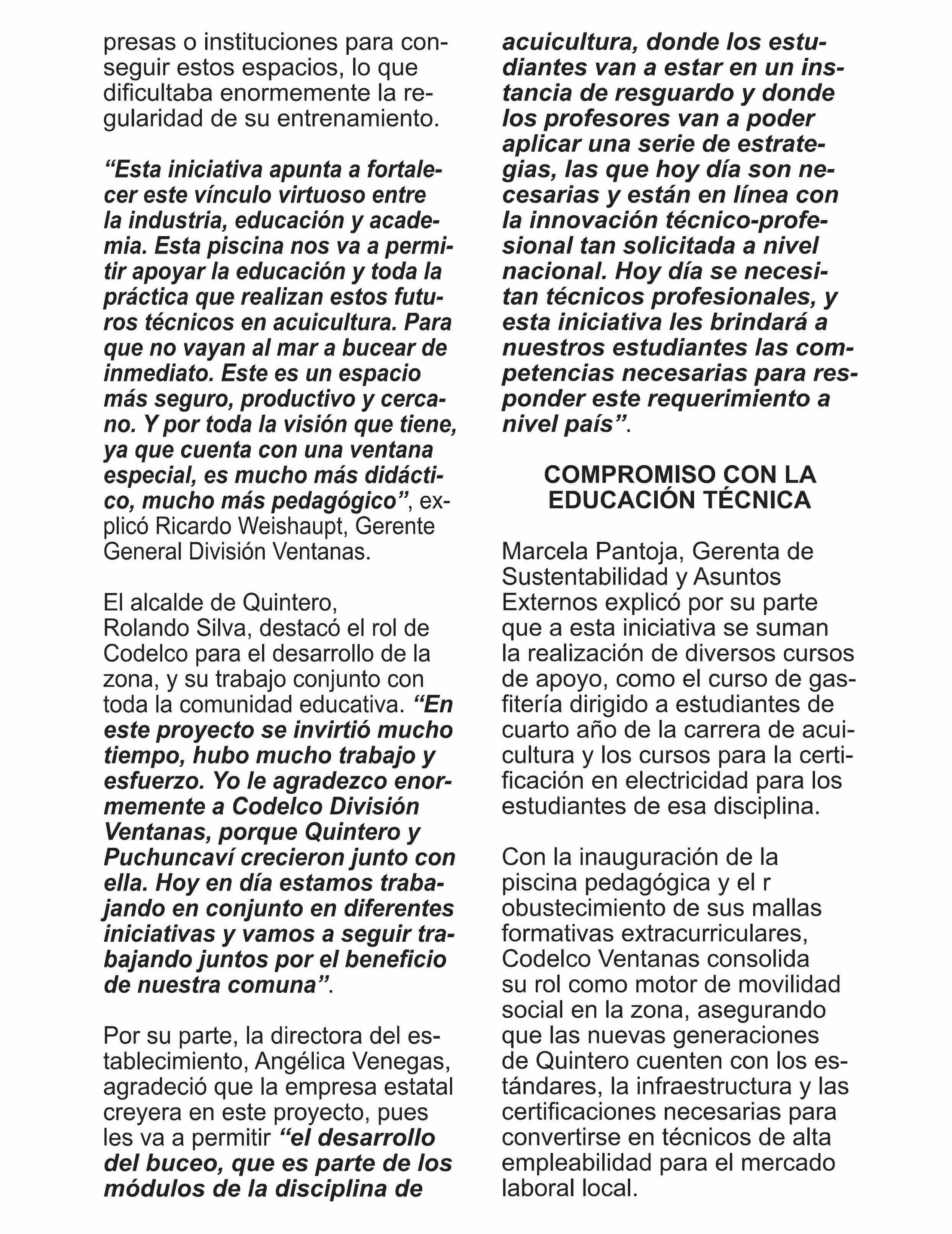 | Título: | Codelco Ventanas y Liceo Politécnico de Quintero inauguran piscina pedagógica para formación de técnicos en acuicultura |