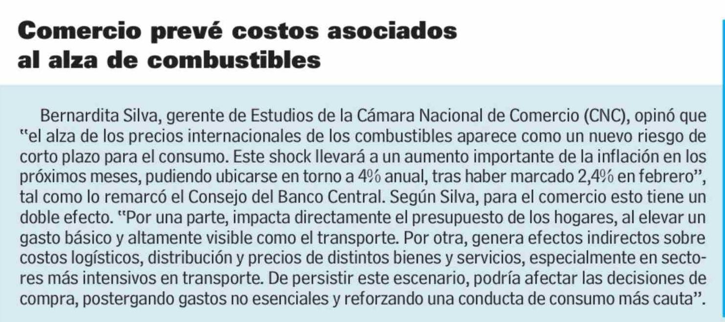 Título: Comercio prevé costos asociados al alza de combustibles Bernardita Silva, gerente de Estudios de la Cámara Nacional de Comercio (CNC), opinó que "el alza de los precios internacionales de los combustibles aparece como un nuevo riesgo de corto plazo para el consumo. Este shock llevará a un aumento im