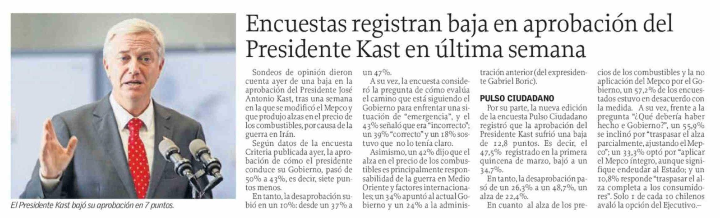 Encuestas registran baja en aprobación del Presidente Kast en última semana