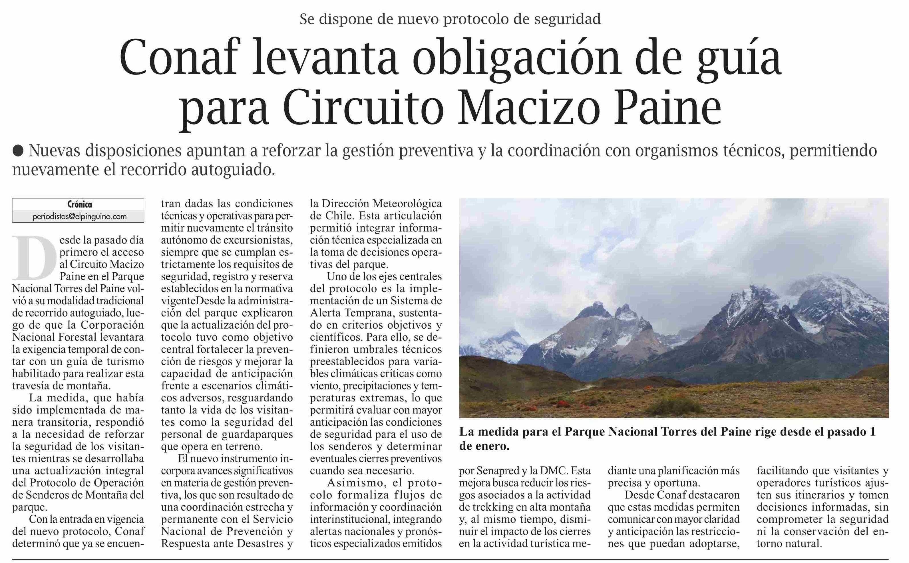 Conaf levanta obligación de guía para Circuito Macizo Paine