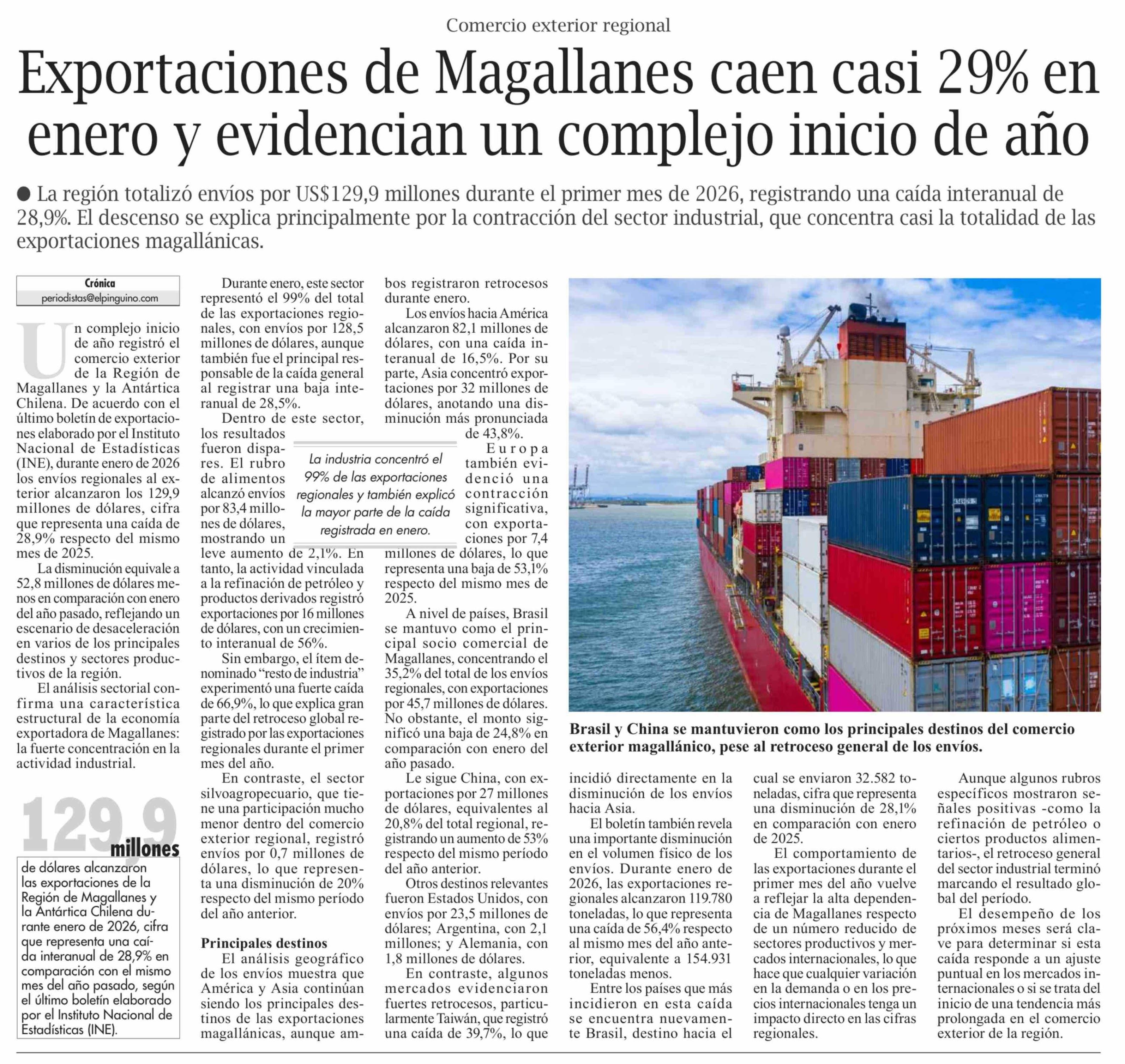 Exportaciones de Magallanes caen casi 29% en enero y evidencian un complejo inicio de año