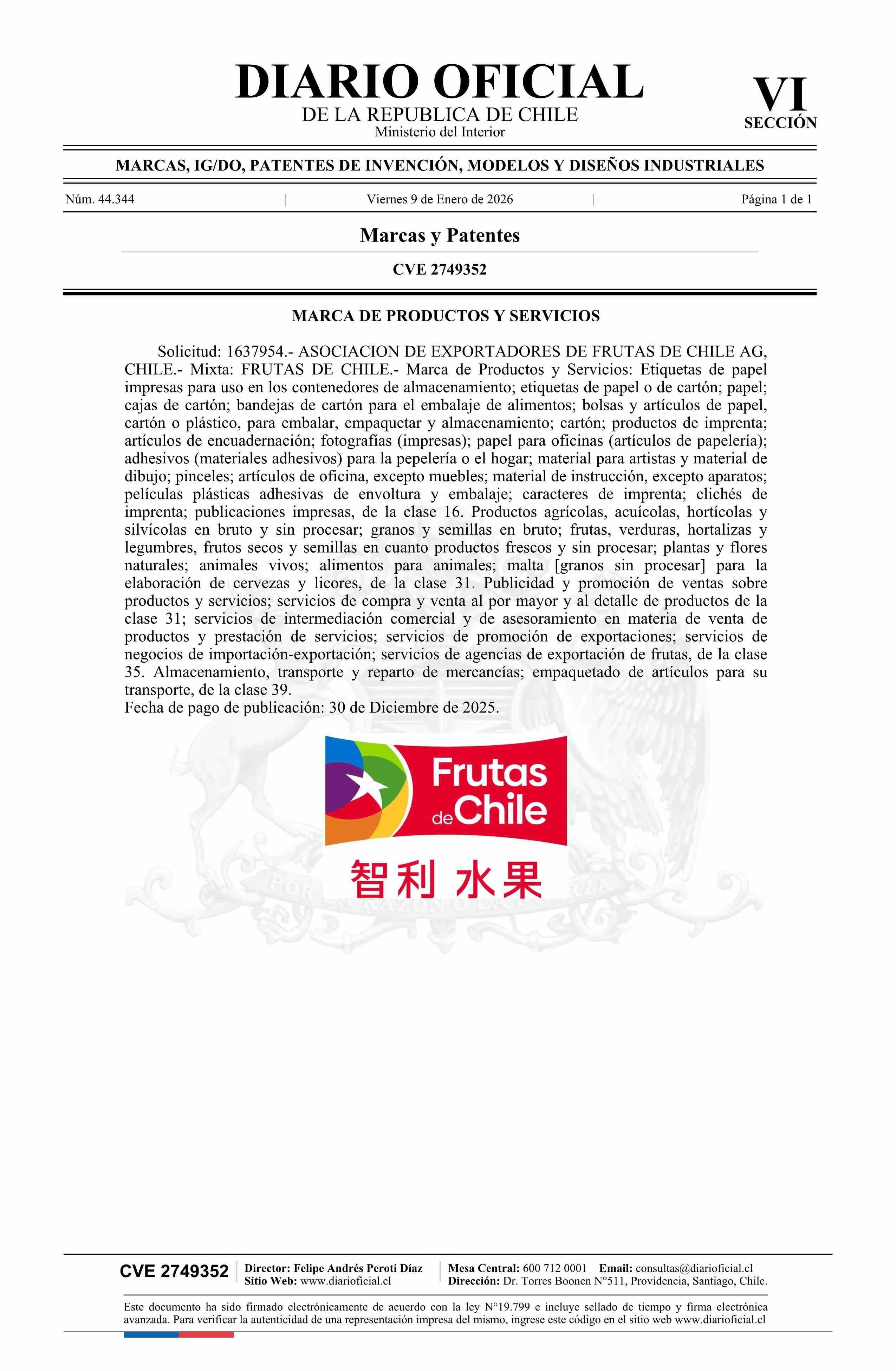 Solicitud número 1637954.- FRUTAS DE CHILE