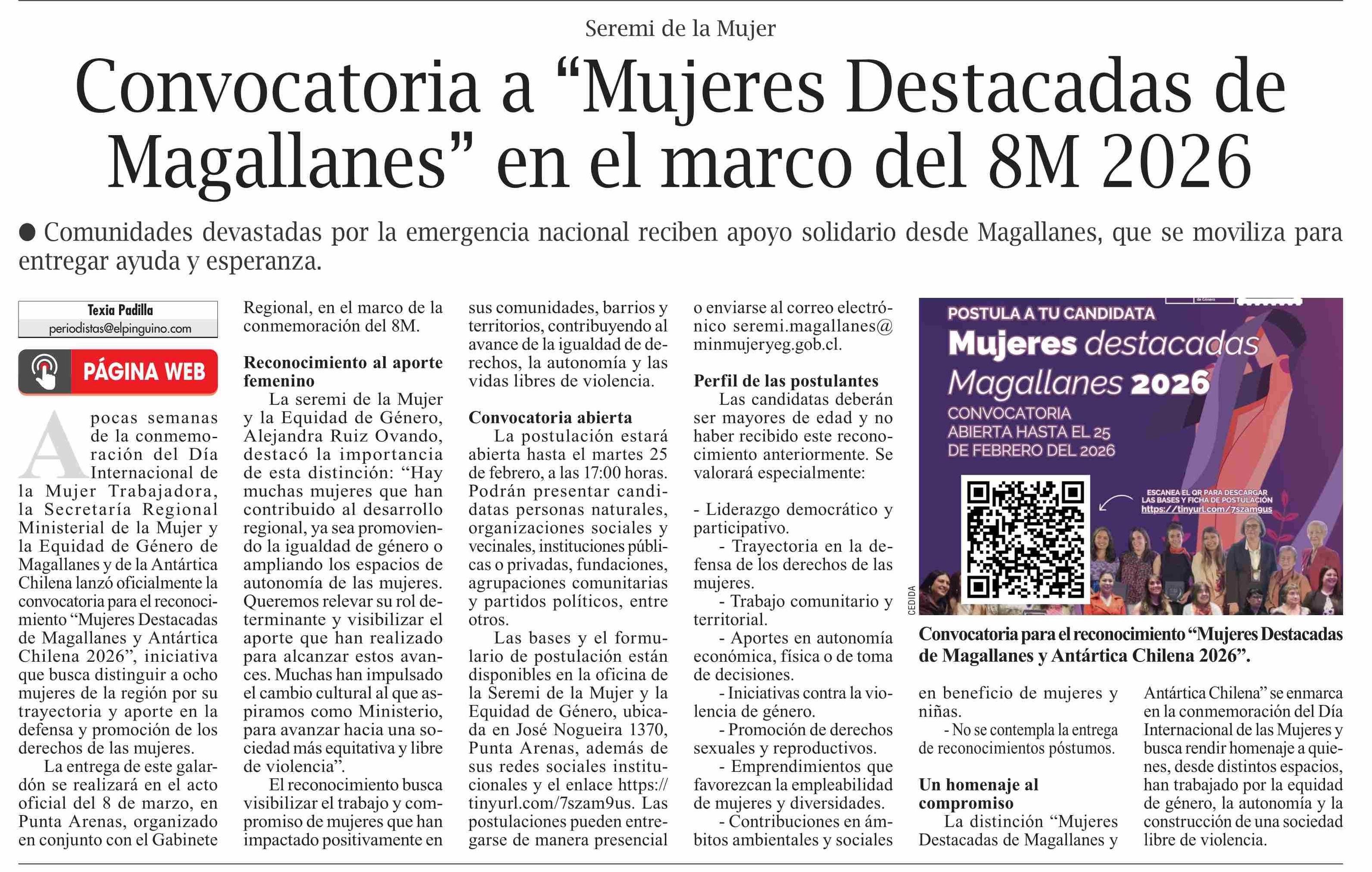 Convocatoria a "Mujeres Destacadas de Magallanes" en el marco del 8M 2026