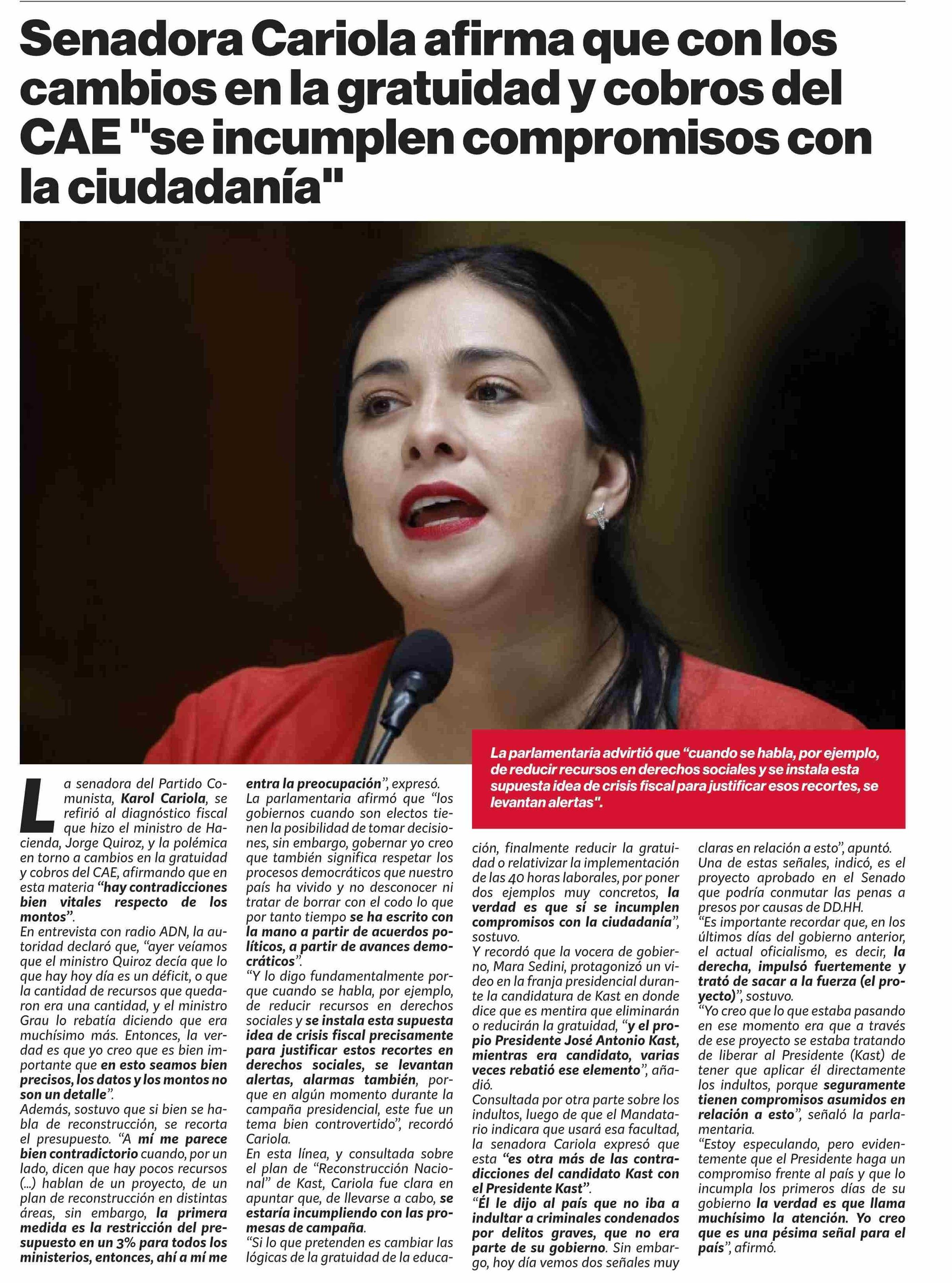Senadora Cariola afirma que con los cambios en la gratuidad y cobros del CAE "se incumplen compromisos con la ciudadanía"