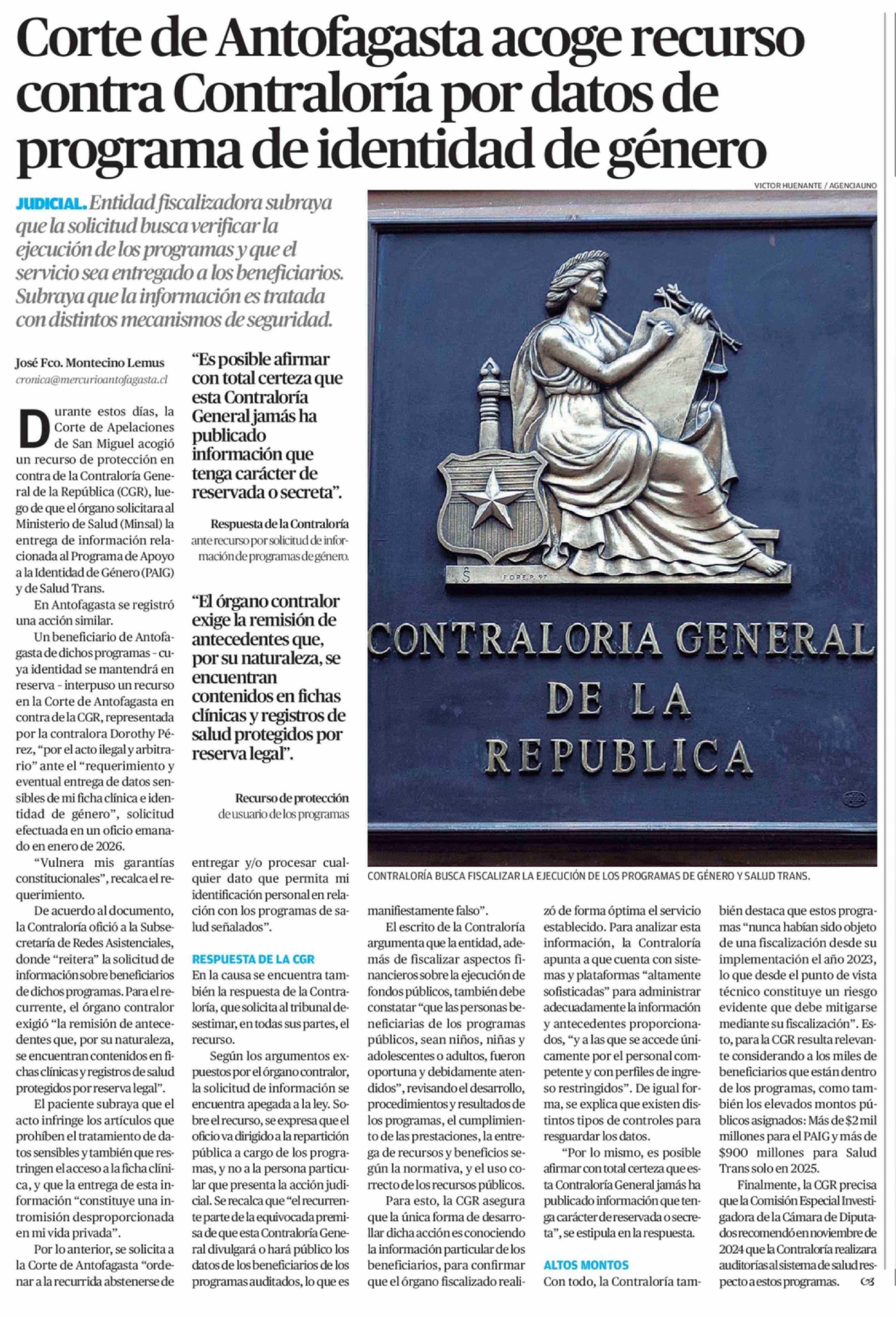 Corte de Antofagasta acoge recurso contra Contraloría por datos de programa de identidad de género