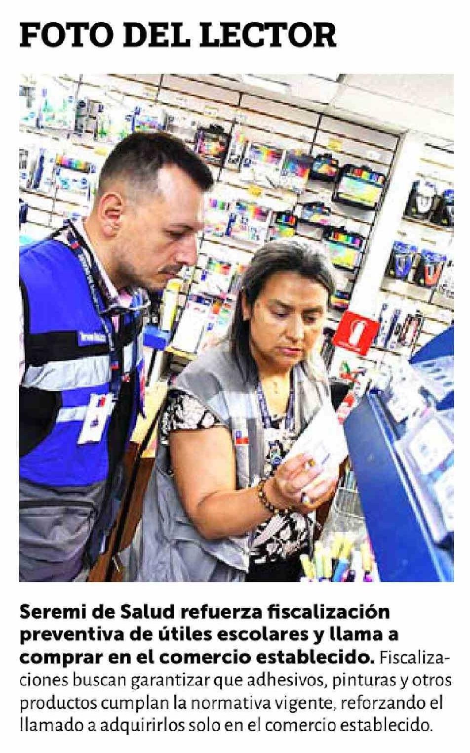 | Título: | Seremi de Salud refuerza fiscalización preventiva de útiles escolares y llama a comprar en el comercio establecido. Fiscalizaciones buscan garantizar que adhesivos, pinturas y otros productos cumplan la normativa vigente, reforzando el llamado a adquirirlos solo en el comercio establecido. |