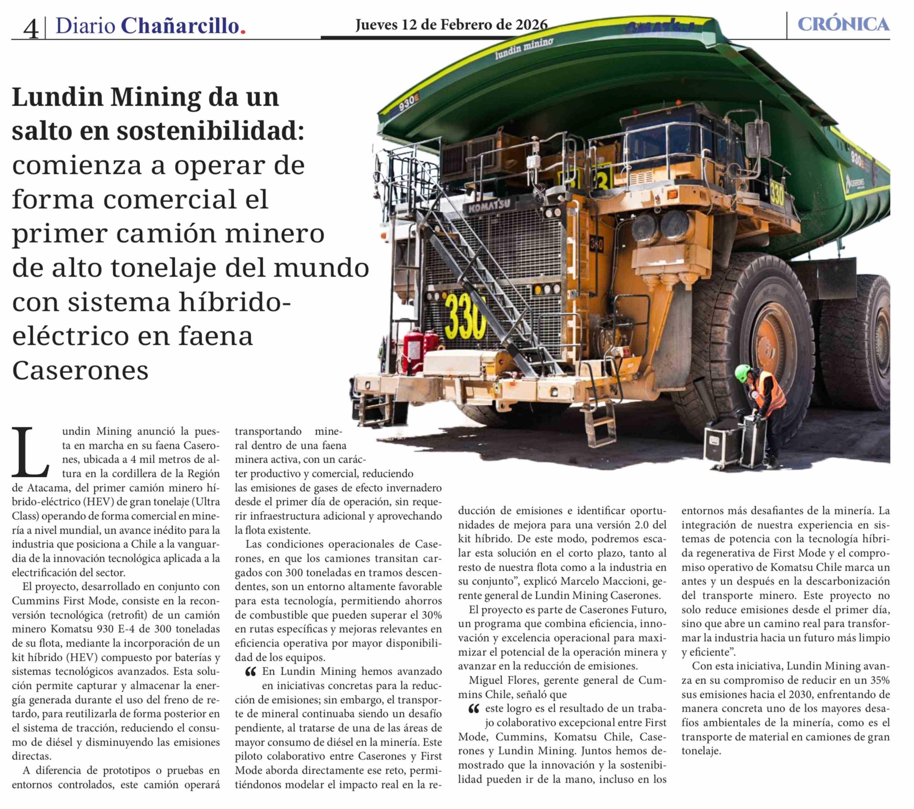 | Título: | Lundin Mining da un salto en sostenibilidad: comienza a operar de forma comercial el primer camión minero de alto tonelaje del mundo con sistema híbridoeléctrico en faena Caserones |