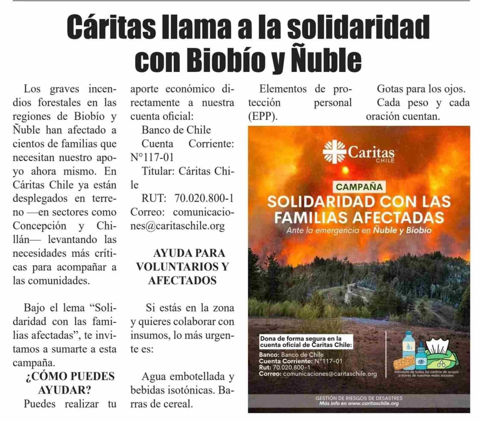 Cáritas llama a la solidaridad con Biobío y Ñuble