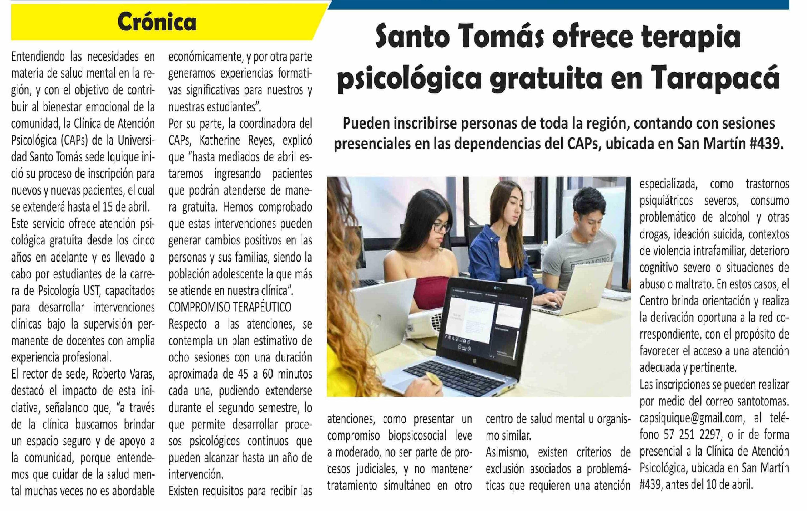 Santo Tomás ofrece terapia psicológica gratuita en Tarapacá