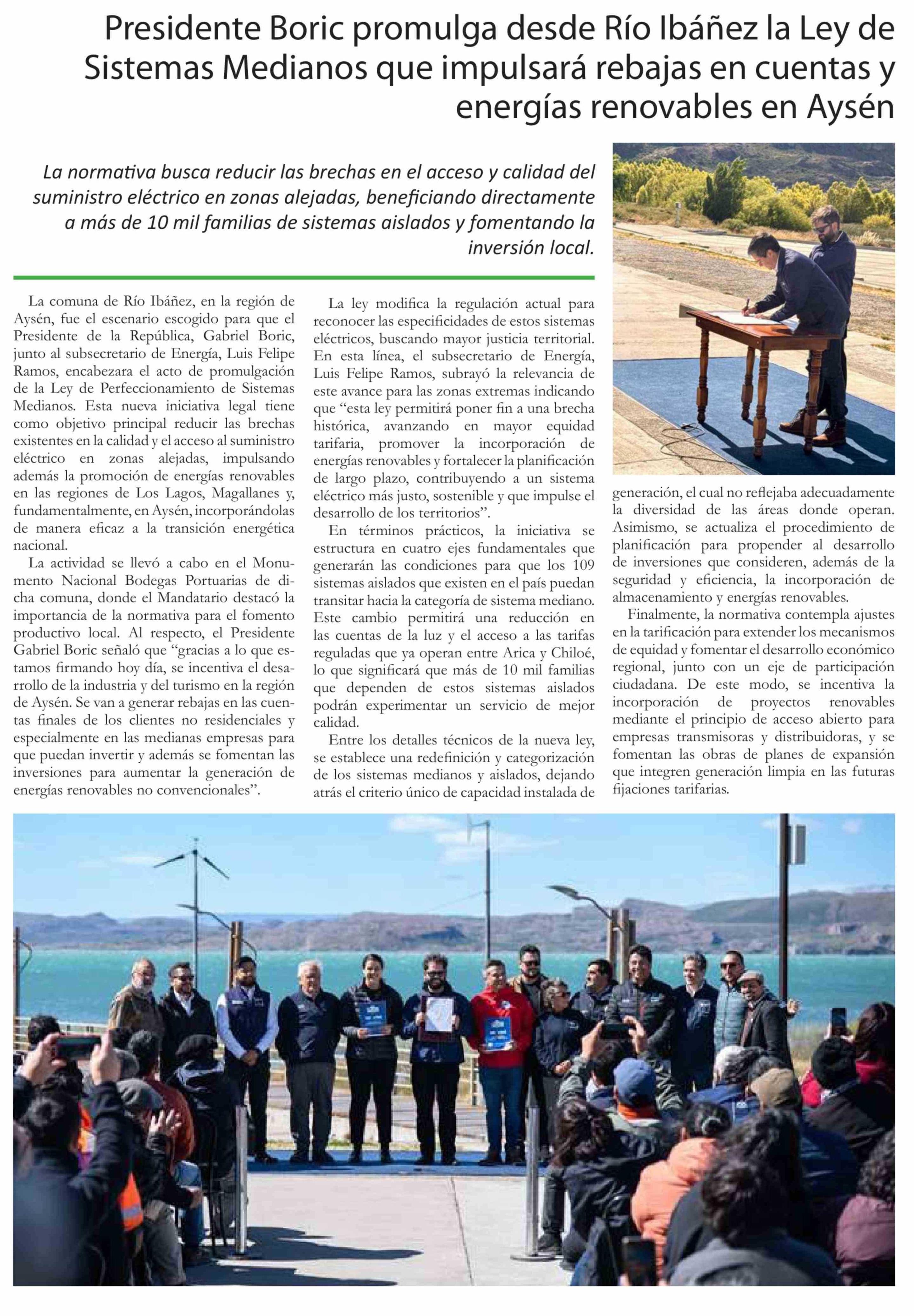 | Título: | Presidente Boric promulga desde Río Ibáñez la Ley de Sistemas Medianos que impulsará rebajas en cuentas y energías renovables en Aysén |