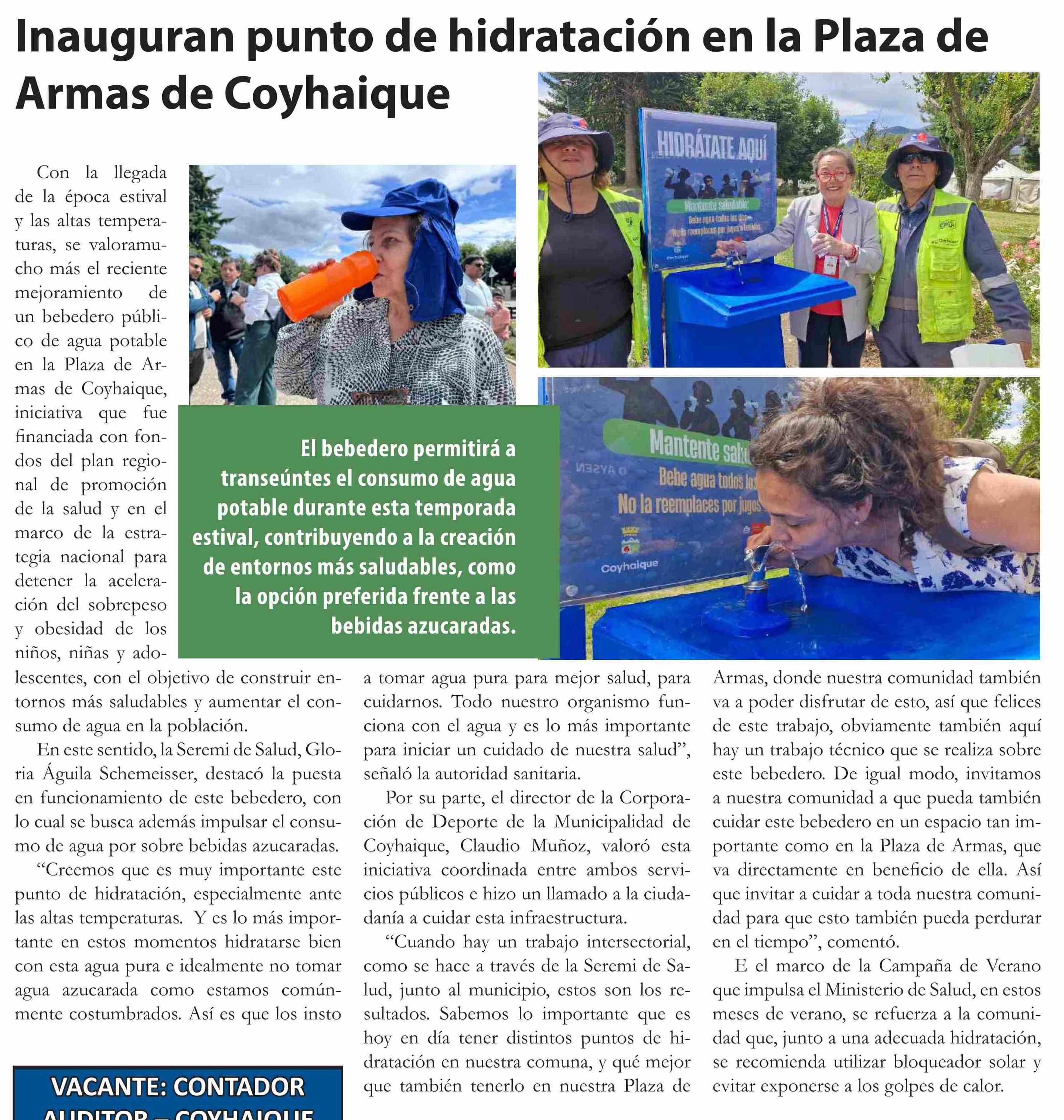 Inauguran punto de hidratación en la Plaza de Armas de Coyhaique