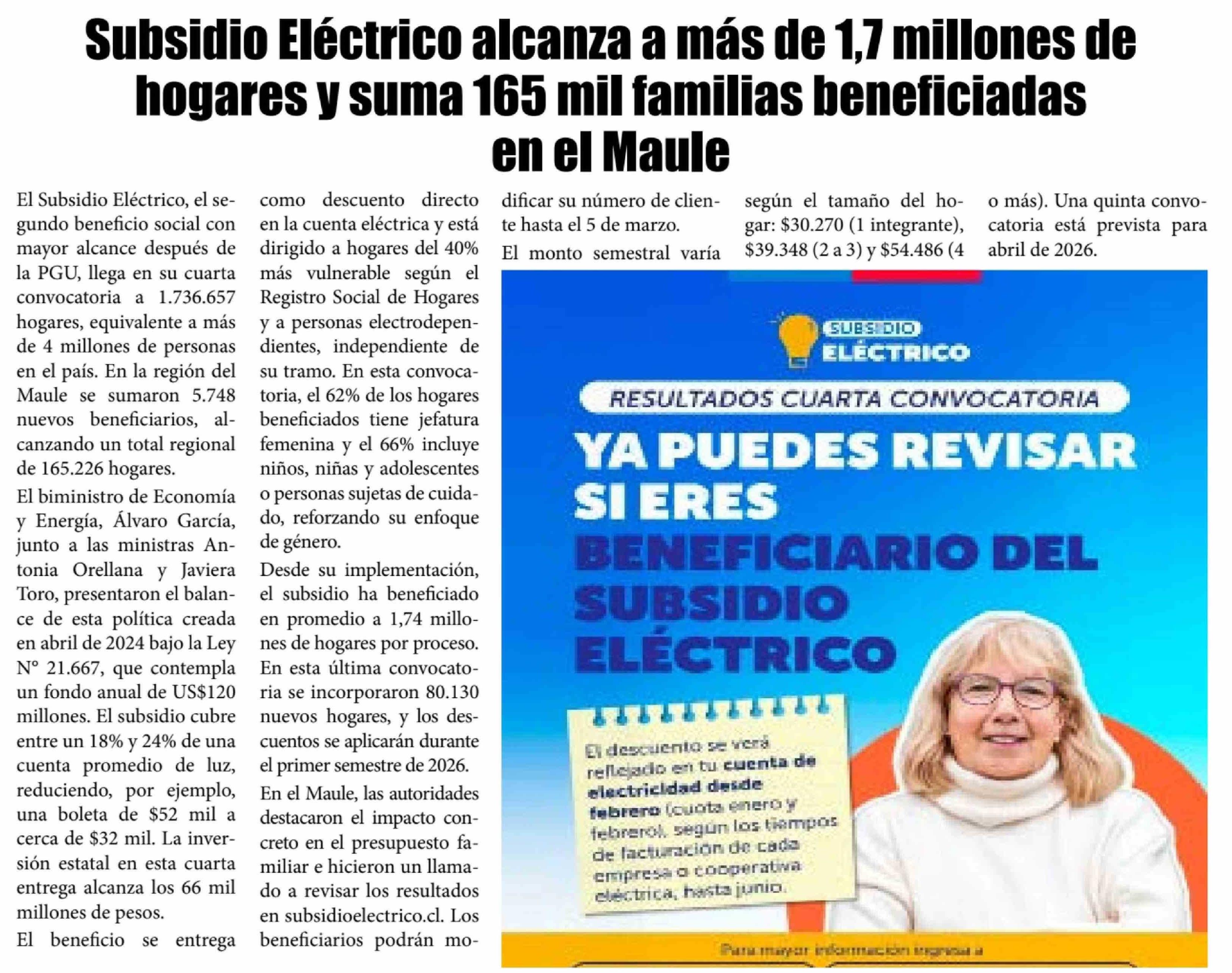 Subsidio Eléctrico alcanza a más de 1,7 millones de hogares y suma 165 mil familias beneficiadas en el Maule